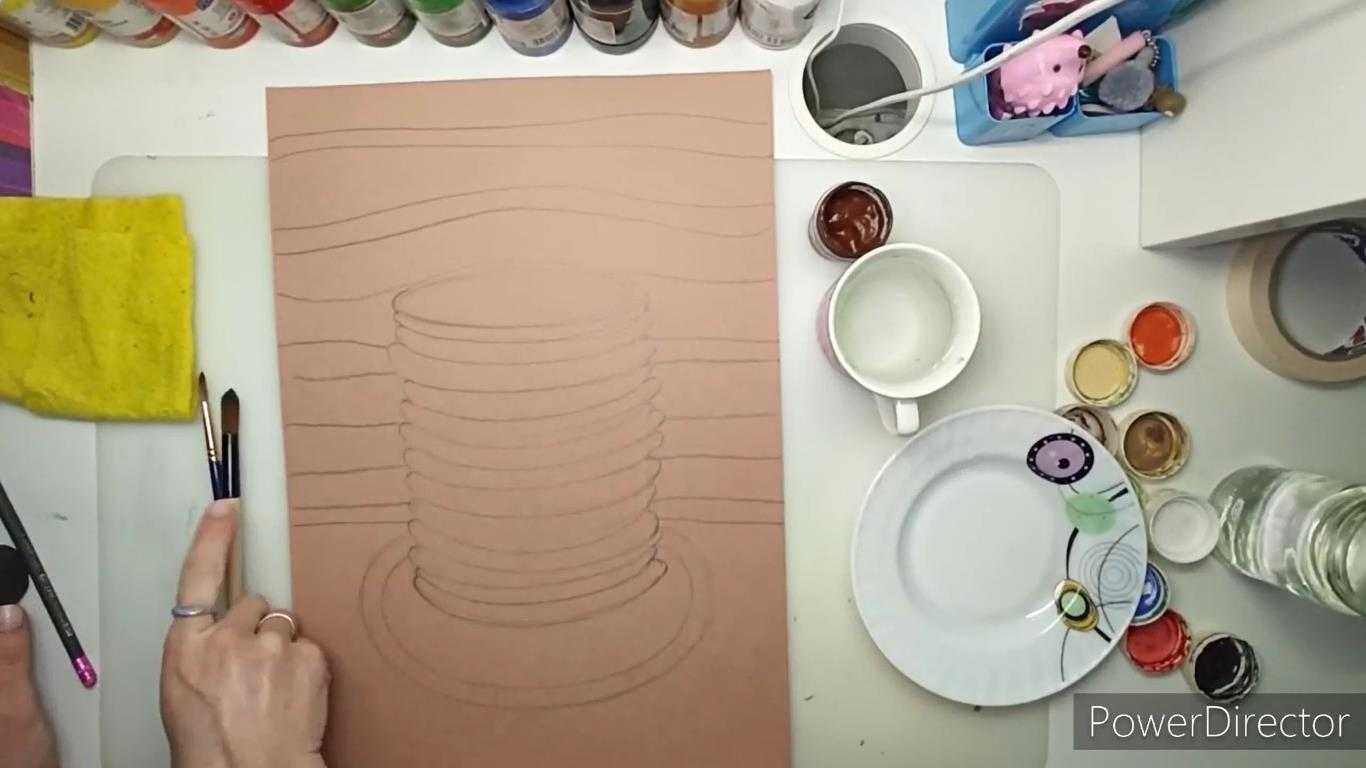 Пока сохнет фон займемся центром. Охрой заполняем блинчики, делаем движения по полукругу. Обрисовываем контур тарелки черным тоном, а серединку белилами. Делаем голубые мазки на блюдце. Под ним нанесем грязным цветом тень.