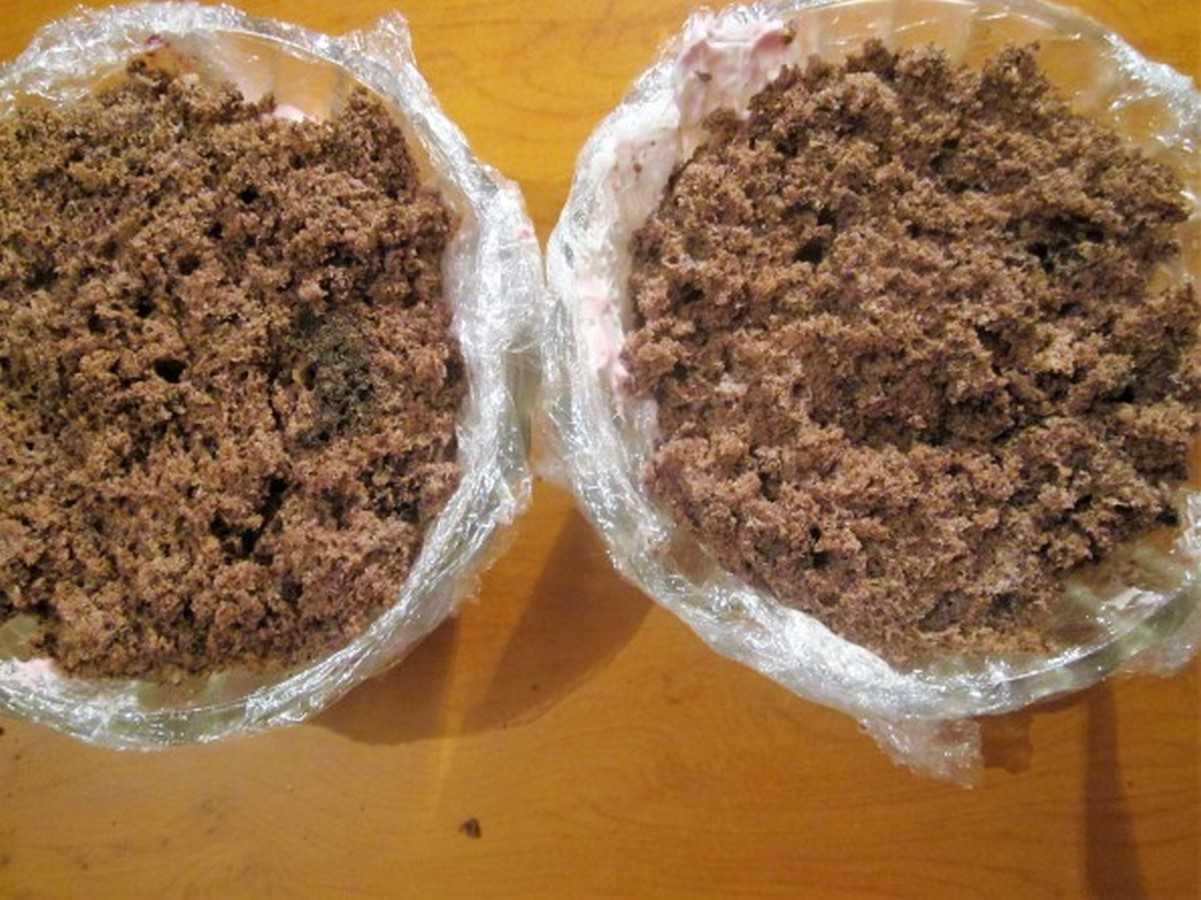 - Бисквит делим на 4 части, подравниваем края, обрезки подсушиваем и перемалываем в крошку.