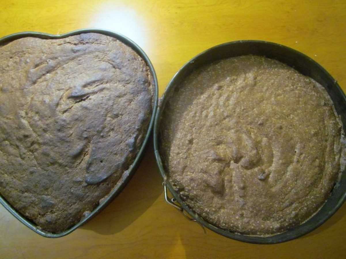 - Вначале выпекаем два шоколадных бисквита по этому рецепту. Для торта-сердце 8 белков отделяем от желтков, взбиваем до крепких пиков. Затем, продолжая взбивать, постепенно добавляем 1 и 1/3 стакана сахара. Затем взбиваем желтки, минуты две до увеличения в объеме. Просеиваем на взбитые белки 1 и 1/3 стакана муки, сверху выливаем желтки и просеиваем 3 столовые ложки какао. Аккуратно перемешиваем ложкой или лопаточкой. Выкладываем в форму, застеленную пергаментом и выпекаем в заранее разогретой до 190 градусов духовке примерно 30 минут (до сухой спички). Пошаговый рецепт шоколадного бисквита здесь.