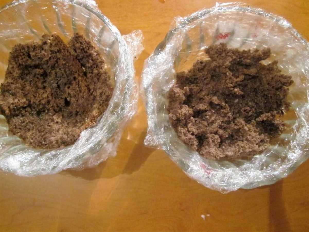 10. Для груди я взяла две одинаковые чашечки, чтобы не мучиться с выравниванием. Обязательно постелить в них пищевую пленку, чтоб потом вытащить наше пирожное. Вырезаем круги из бисквита и кладем на дно.