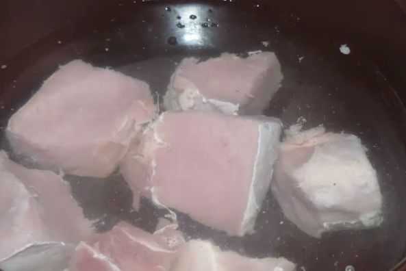 1. Берём свежее мясо (свинина, говядина, курица), режем на небольшие кусочки. Складываем в кастрюлю и заливаем водой. Ставим на огонь и варим до готовности. При этом не забудьте посолить и положить специи: лавровый лист и перец горошком.
