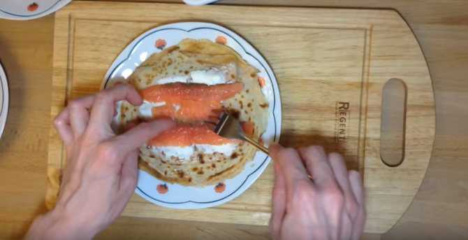 5. Любителям суши посвящается. Блин смазать сливочным сыром и выложить по всей его площади тонким слоем красную рыбу. Свернуть трубочкой и нарезать на порционные кусочки.