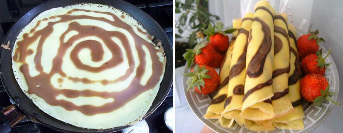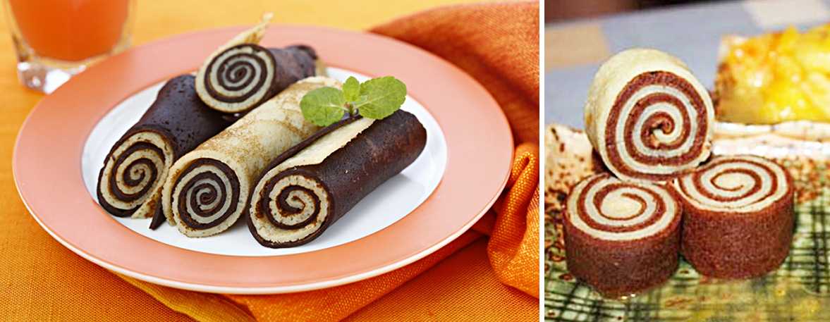 Очень красиво выглядят многослойные трубочки с разными начинками, которые, конечно, должны сочетаться друг с другом. Например, приготовьте три открытые трубочки, одну из них начините творогом, вторую — банановым пюре, третью — ягодами. Выложите трубочки на четвертый блинчик пирамидкой, заверните его, так чтобы стык оказался внизу, и красиво выровняйте края острым ножом.