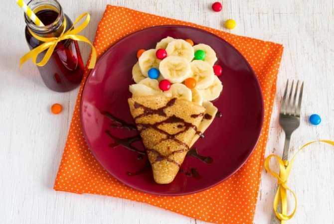 2. Оригинальные блинчики с бананом. Этот вариант подойдет также для детского праздника. Накормить малоежек иногда очень трудно. А любимый многими фрукт, завернутый в сытный блин, может спасти ситуацию. Тут все просто — очищенный банан завернуть в блинчик, ножом разделить на несколько частей. Можно полить медом или другим сладким соусом.