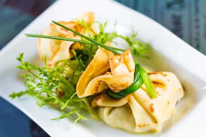 3. Мешочки с сюрпризом. Любимую начинку положить в середину блина и закрыть по принципу мешка. Закрепить перышком зеленого лука. Такое свежее и яркое угощение отлично подойдет для масленичного стола.