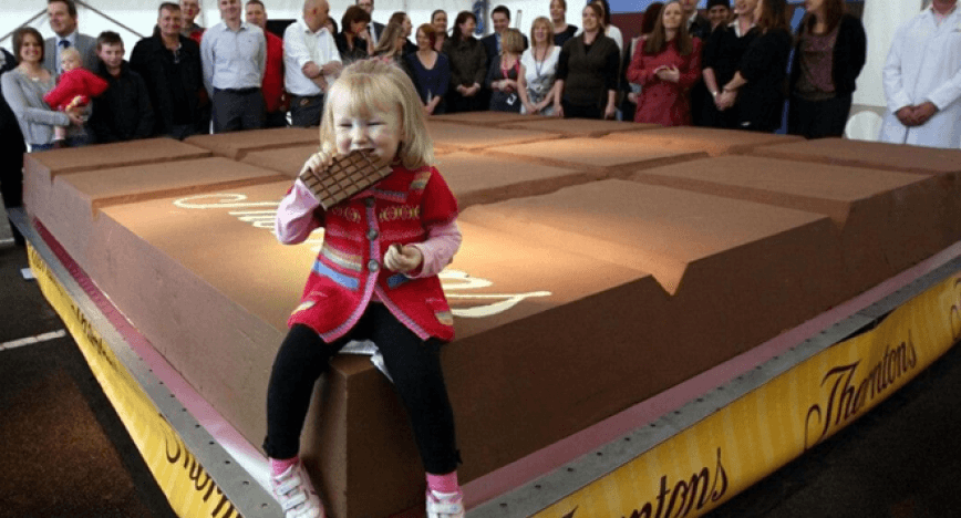 Компания Thorntons, выпускающая кондитерские изделия в Великобритании, решила порадовать почтенную публику на свой юбилей. А ей в сентябре 2011 года исполнилось 100 лет. Компания изготовила самую большую в мире шоколадку. Её вес составил 5 тонн 792 кг. По секрету, столько же весят 75 тысяч стандартных шоколадок Thorntons, взвешенные вместе. 50 мастеров целых десять часов заливали шоколад в форму. После чего плитка застывала трое суток.