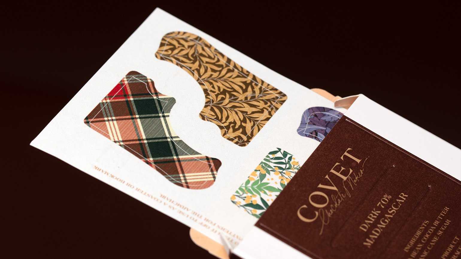 Поверх шоколада лежит полупрозрачная глянцевая бумага Seveso. Её украшают символы таблицы Менделеева из голографической фольги. Так дизайнеры в очередной раз напоминают об инженерном прошлом основателя бренда.