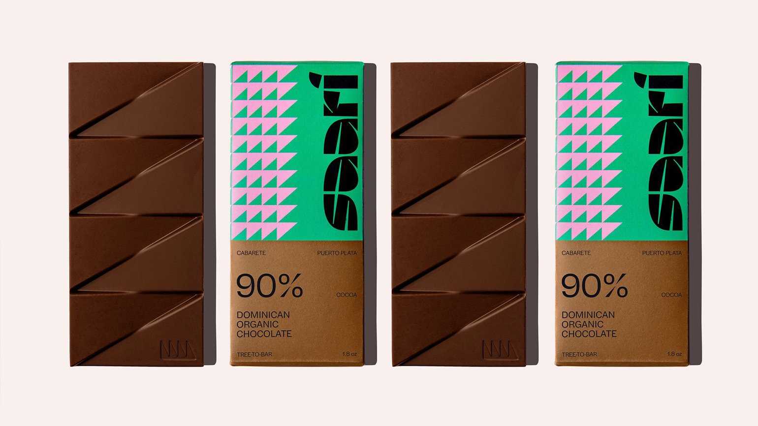 Ключевой элемент дизайна — пальмовые ветви, упрощённые до трегульников, количество которых отражает процент содержания какао в шоколаде. На листья пальмы намекают и необычные буквы, которыми написано название бренда.