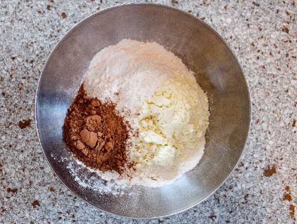 В отдельную миску поместите муку, сухое молоко, порошок какао и пищевую соду.