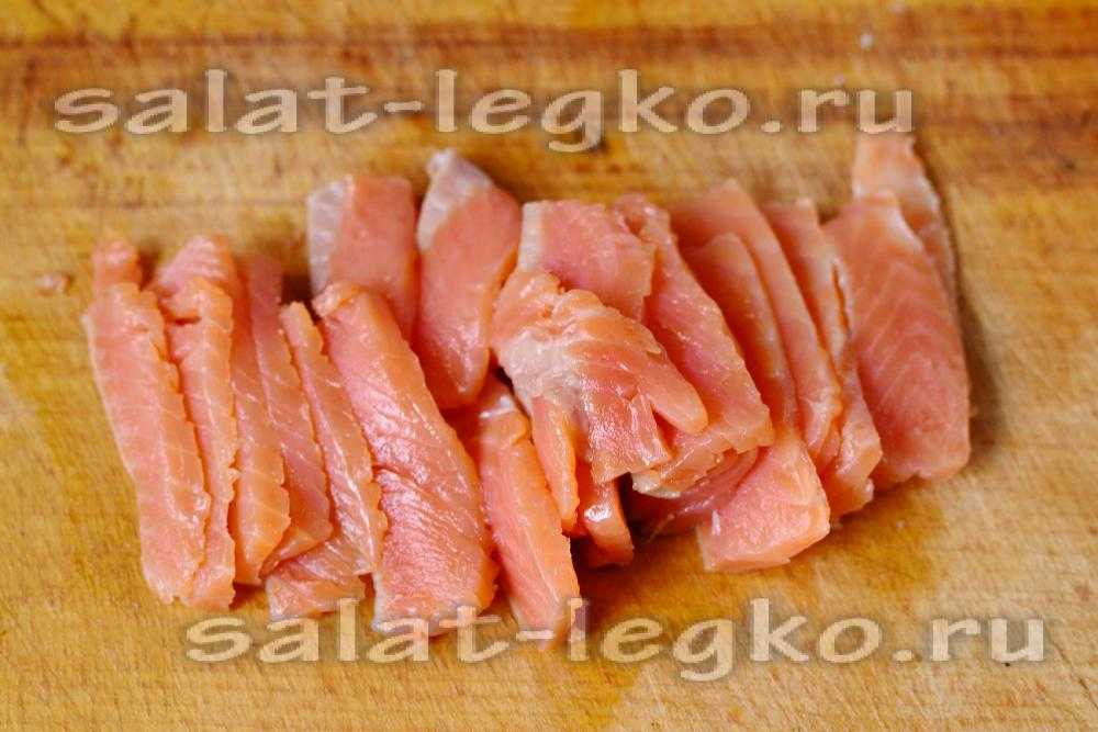 6. Приступаем к нарезке рыбы. Если вы хотите, чтобы ваши кусочки получились тонкими и ровными, стоит нарезать её не поперёк куска, а вдоль него. Полученные полоски рыбы равномерно выкладываем первым слоем в нашей форме.