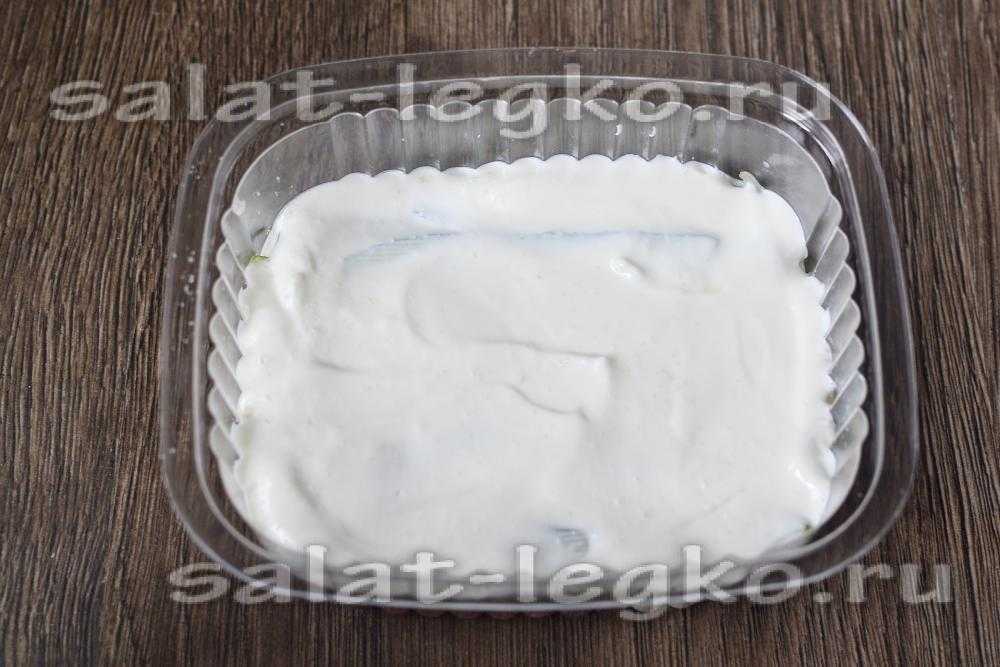 9. На слой с огурцами снова выкладываем сливочный сыр. Равномерно распределяем его на поверхности формы и уплотняем новый слой.