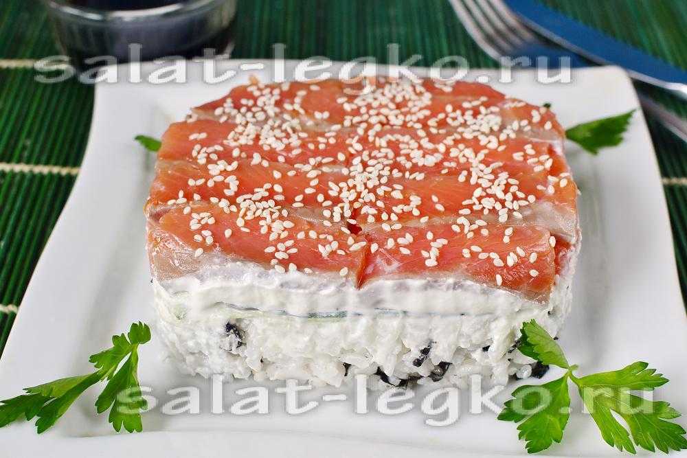 Как приготовить слоеный суши-торт с красной рыбой?