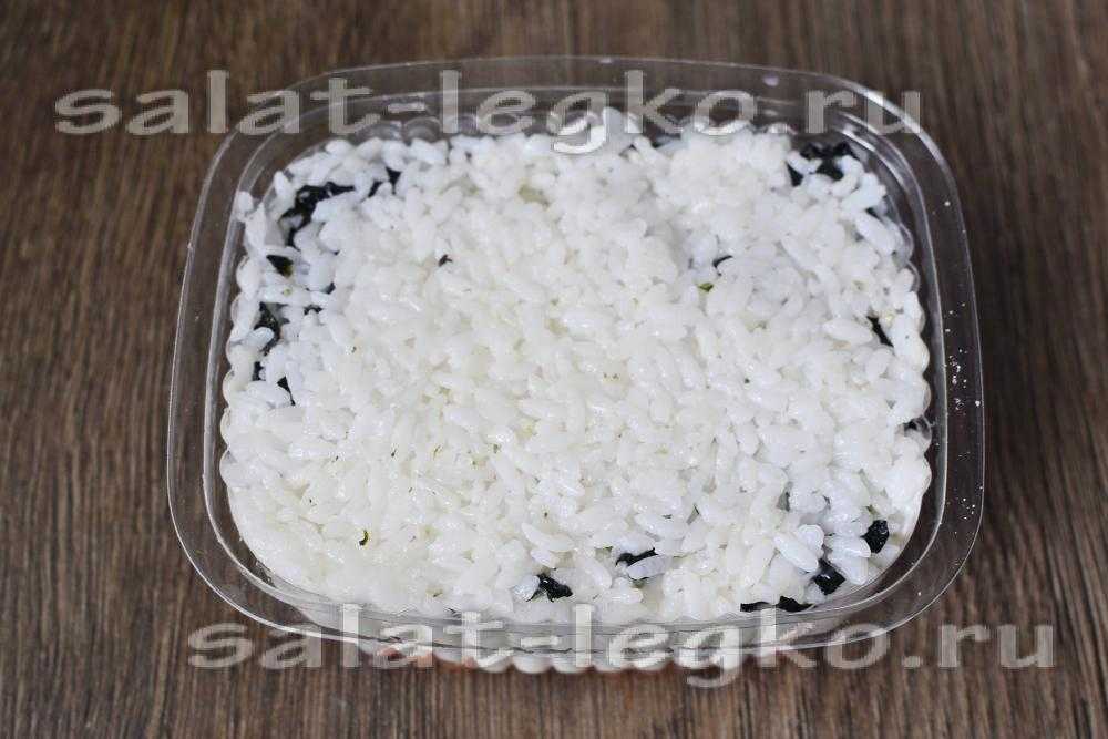Прямоугольную – по листу нори, или круглую – вырезав нори желаемой формы. При этом хорошо собирать торт в разъемной форме для выпечки небольшого диаметра: так удобнее всего утрамбовывать рис.