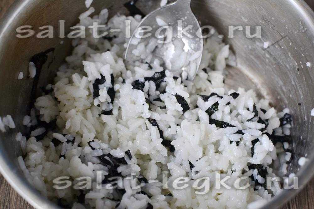 Смешиваем яблочный уксус с сахаром и вливаем его в тёплый рис, добавляем измельчённый лист водорослей и очень аккуратно вымешиваем массу.