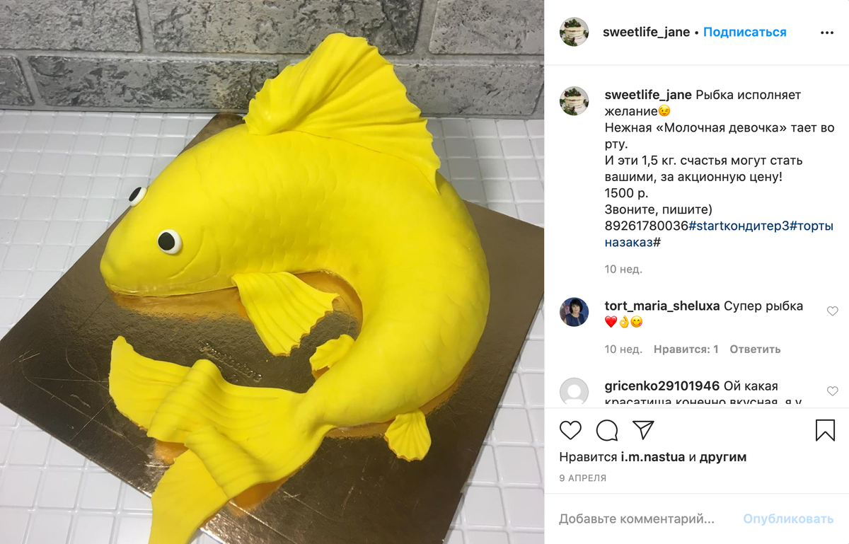 Некоторые пекут торты в виде животных, машин, книг — в общем, чего угодно. Торт-рыбка с начинкой весит 1,5 кг и стоит 1500 Р
