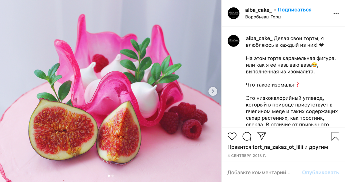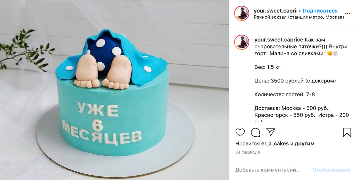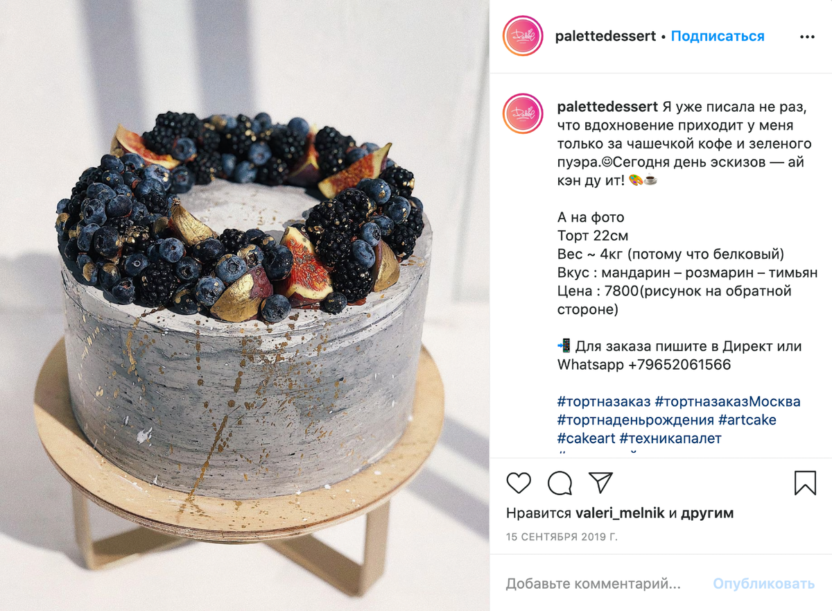 Почти все кондитеры из «Инстаграма»* указывают цену за 1 кг торта, но меньше 1,5—2 кг не пекут, потому что это невыгодно. То есть при стоимости 1600 Р за 1 кг заплатить надо будет минимум 2400 Р. Это не всегда удобно. Если на празднике мало людей, 1,5 кг торта за раз не съесть — остатки придется доедать неделю.