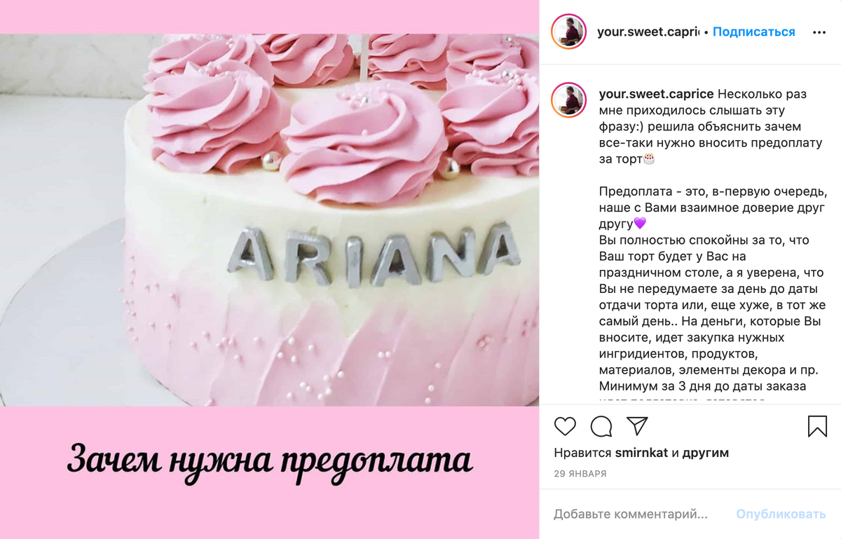 Предоплата. При заказе большинство кондитеров просят предоплату. Я вносила 50%. Для кондитера это гарантия, что он не потратится на продукты зря. При этом заказ надо делать за 3—7 дней до праздника. А если, например, именинник заболеет и мероприятие не состоится, деньги уже не вернуть.