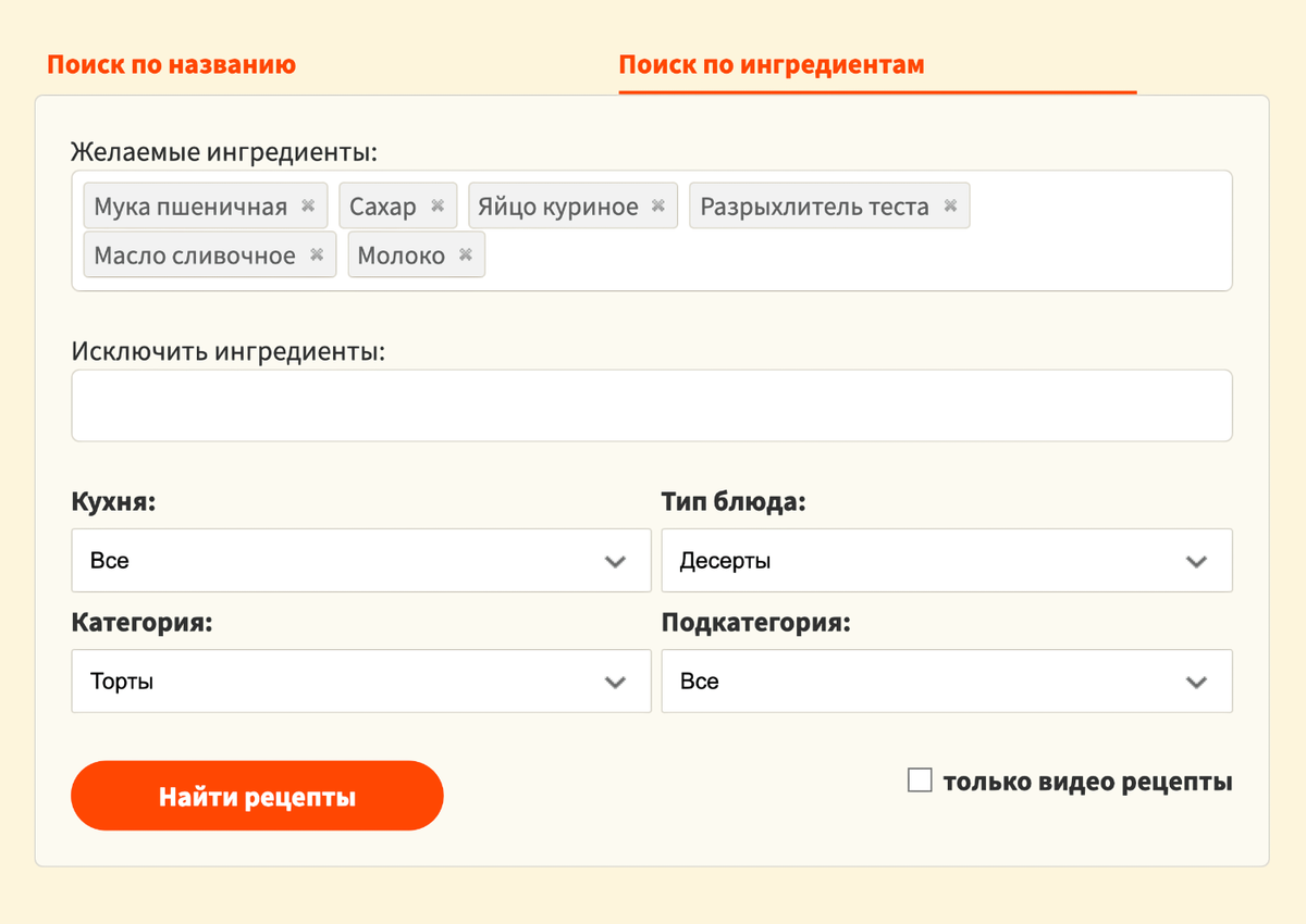 На «Поваренке» есть поиск по ингредиентам. Можно сразу добавить нужные, и сайт скроет рецепты, где чего-то не хватает