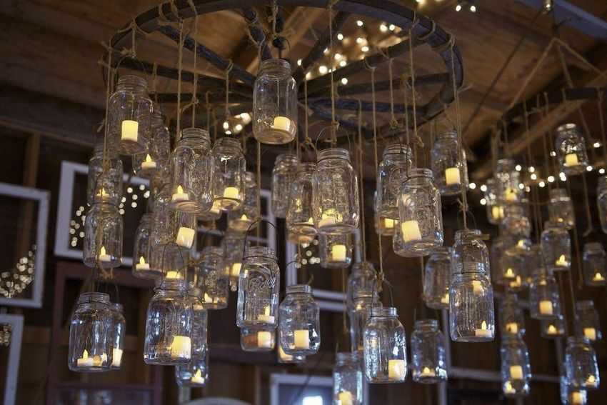 Невероятные светильники из банок, привязанных к джутовым нитям, в качестве источника света использованы свечи.