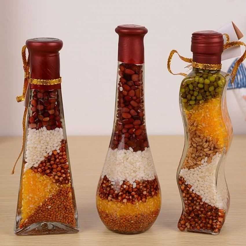 В бутылки можно засыпать различные крупы и это неплохо украсит вашу кухню.