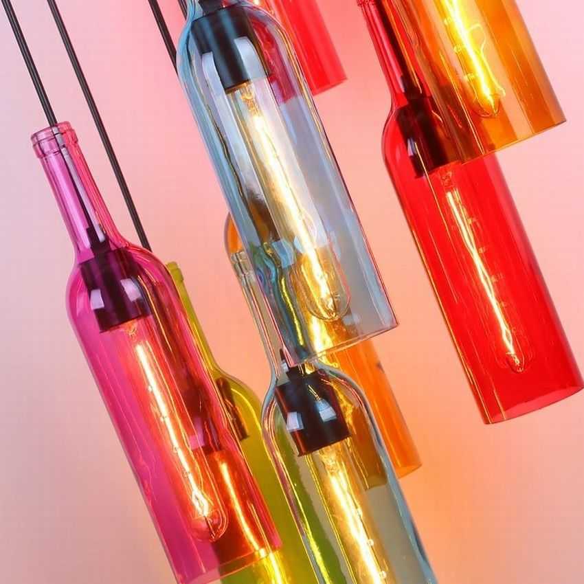 Идеальное решение – использование разноцветных бутылок в оформлении светильников.