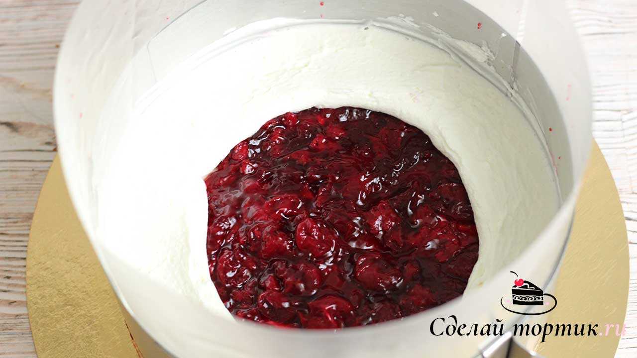 Затем смажьте 2-3 ст.л. крема. Сделайте бортик по краю с помощью кондитерского мешка или просто оставьте 2 см с краю и выложите вишнёвую начинку. Покройте кремом.
