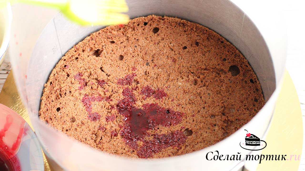 Собирать торт удобнее в кольце для тортов, поскольку крем ещё не стабилизировался. Наденьте кольцо на нижний корж и смажьте его пропиткой