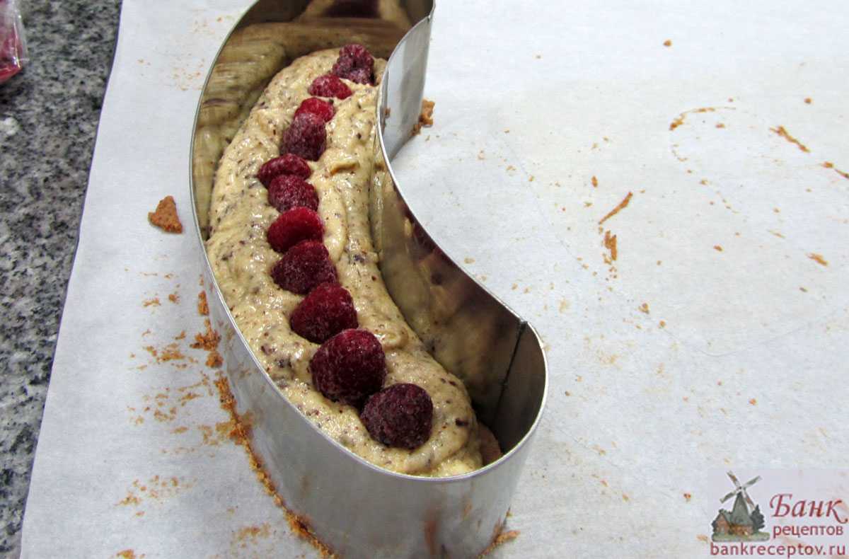 Сверху выкладываем ряд малины (свежей или замороженной) так, чтобы ягоды не касались краев металлических форм. После выпечки все ягоды погрузятся в тесто.