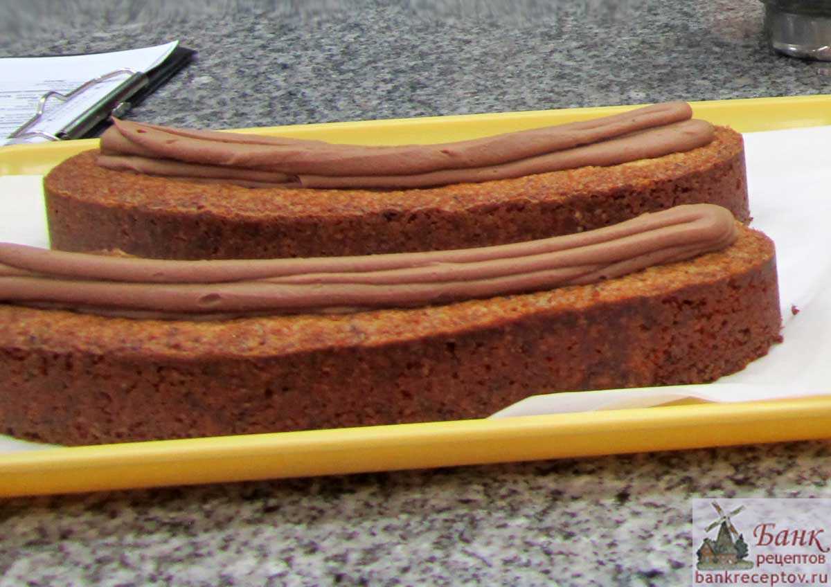 4. Разрезать бисквит на 3 пласта и промазать каждый теплым заварным кремом.