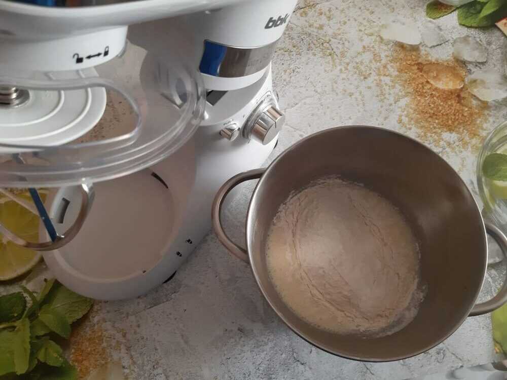 Муку смешать с разрыхлителем и просеять.