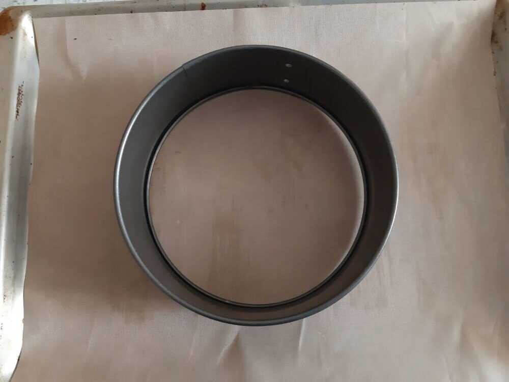 Я использовала разъемную форму без дна, чтобы тесто было удобнее выкладывать по кругу, но можно начертить на пергаменте круг диаметром 25 см, и использовать ее в качестве «трафарета».