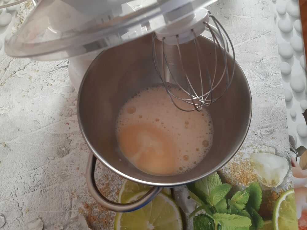 - 1. В миксер выливаем сгущенку и добавляем яйца. Хорошо взбиваем.
