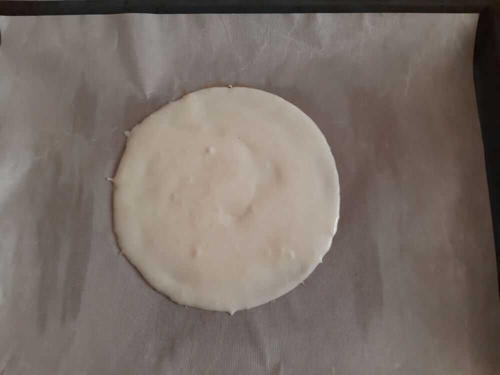 Вам потребуется пищевая пергаментная бумага для выпечки. На ней нужно нарисовать круг диаметром около 20 см. Переверните ее, линия круга все равно будет видна. В пределах него размазывайте тесто, обычно на это уходит примерно три столовых ложки. Постарайтесь, чтобы поверхность тоже была ровной.
