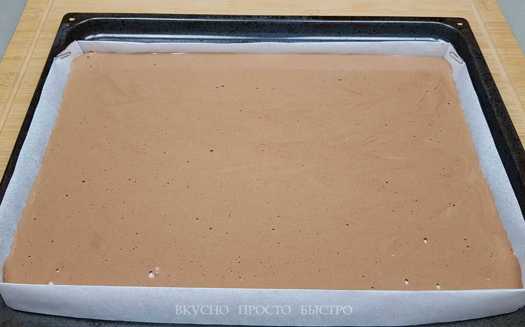 Я выпекаю бисквит на противне застланном пергаментной бумагой. Чтобы тесто не растекалось, я из пергаментной бумаги сделала форму с небольшими бортиками.