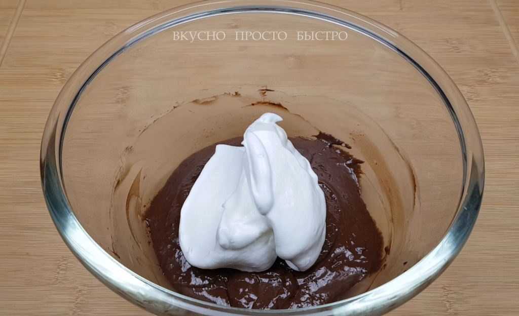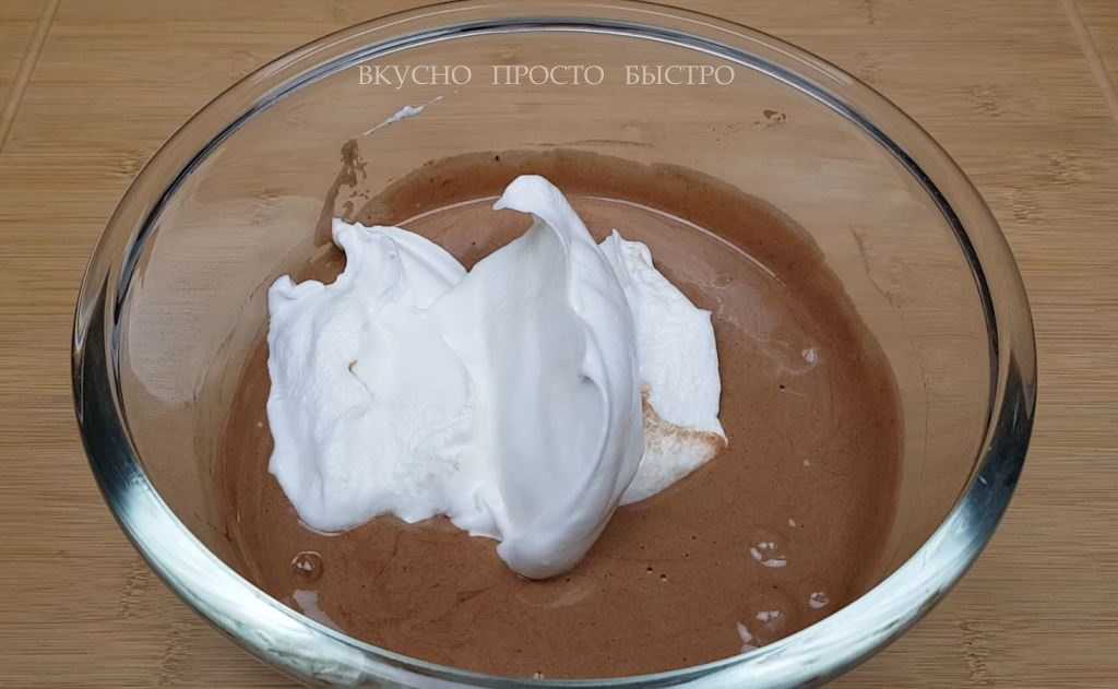 Добавляем часть взбитых белков в тесто и круговыми движениями снизу вверх, лопаткой перемешиваем до однородно состояния.