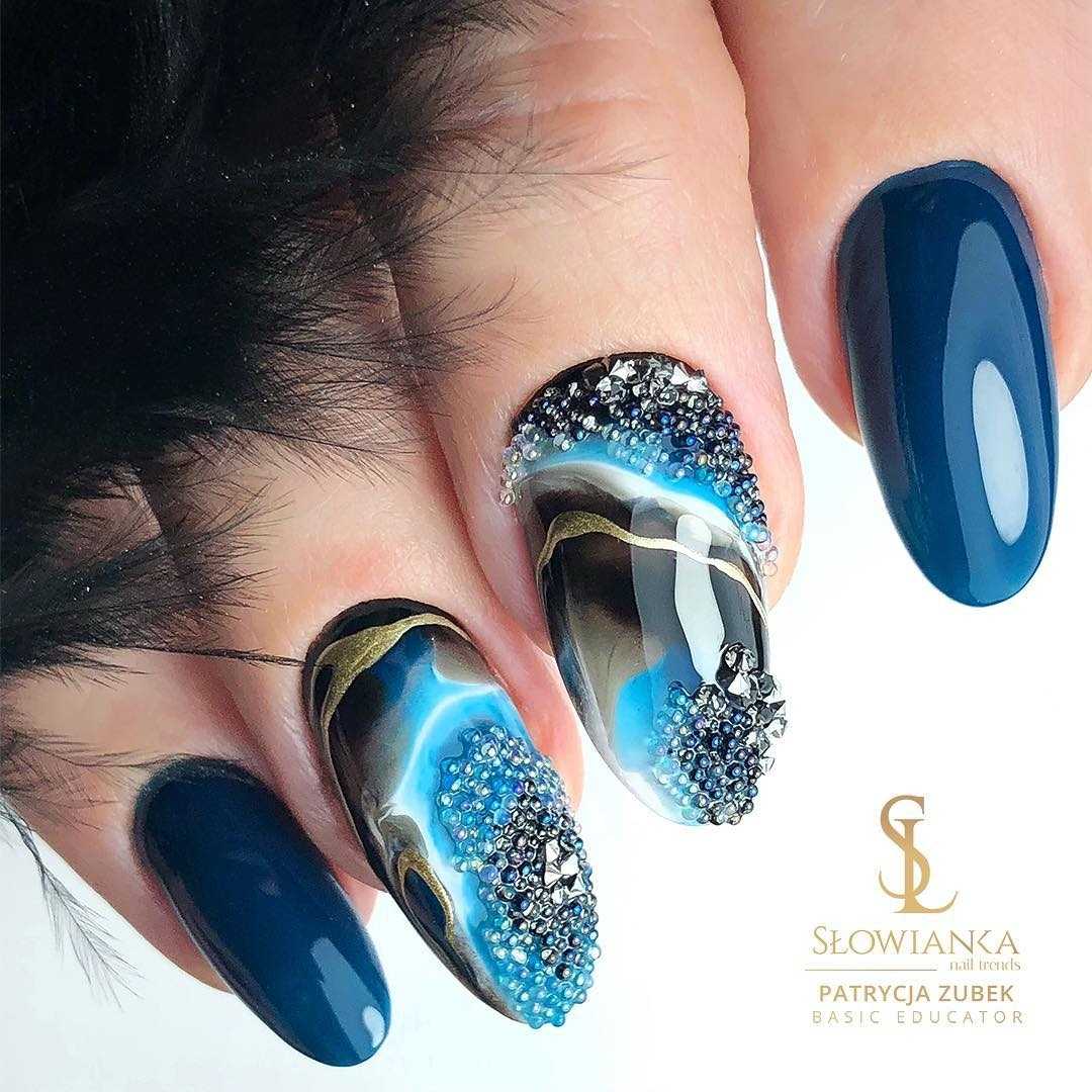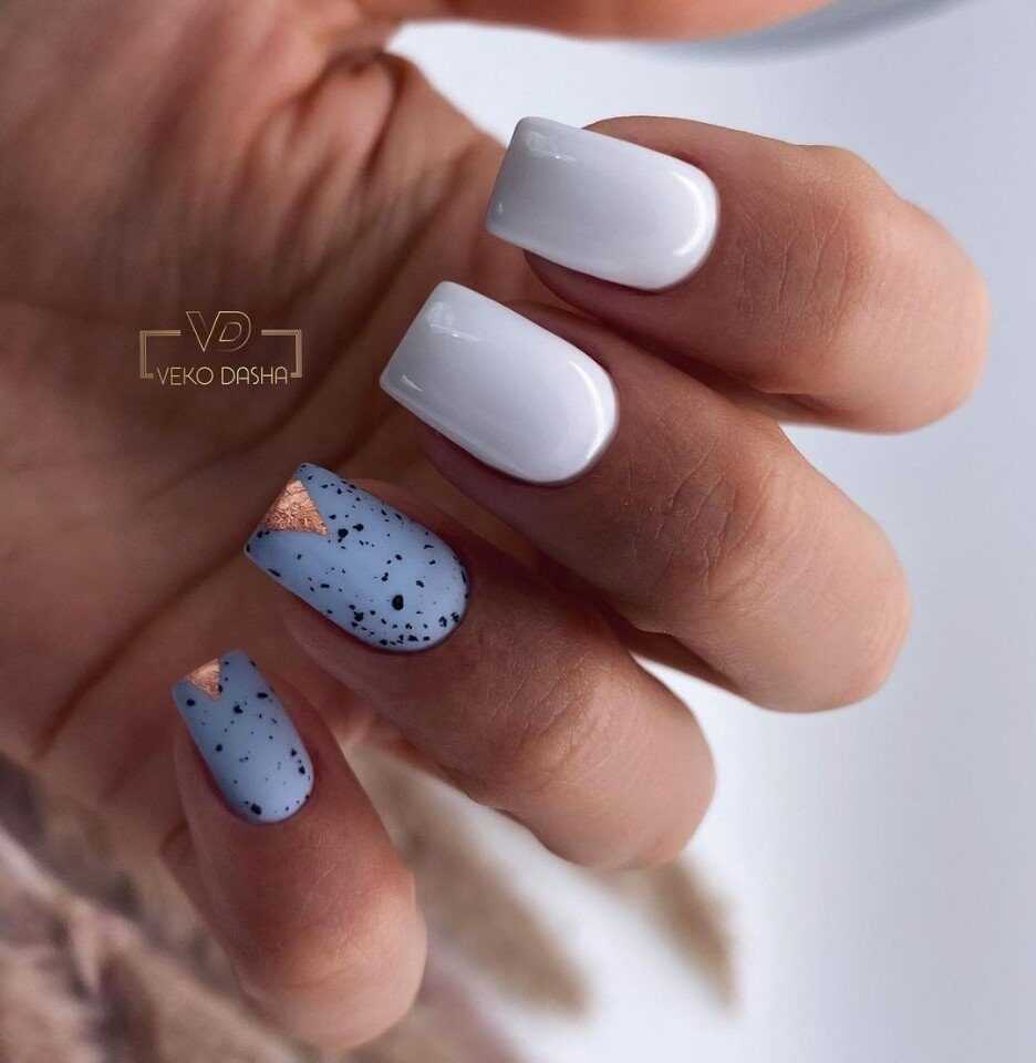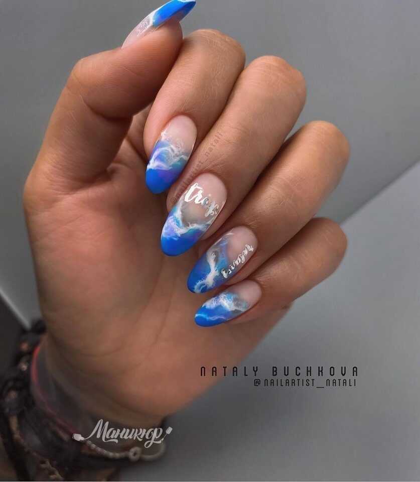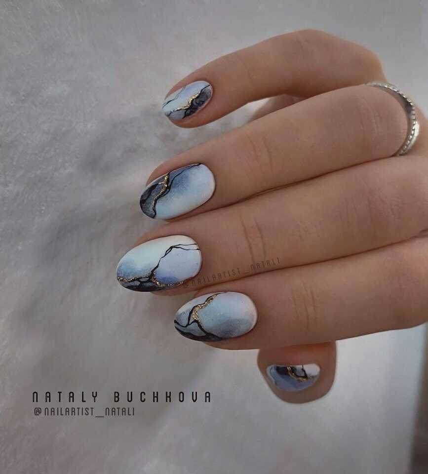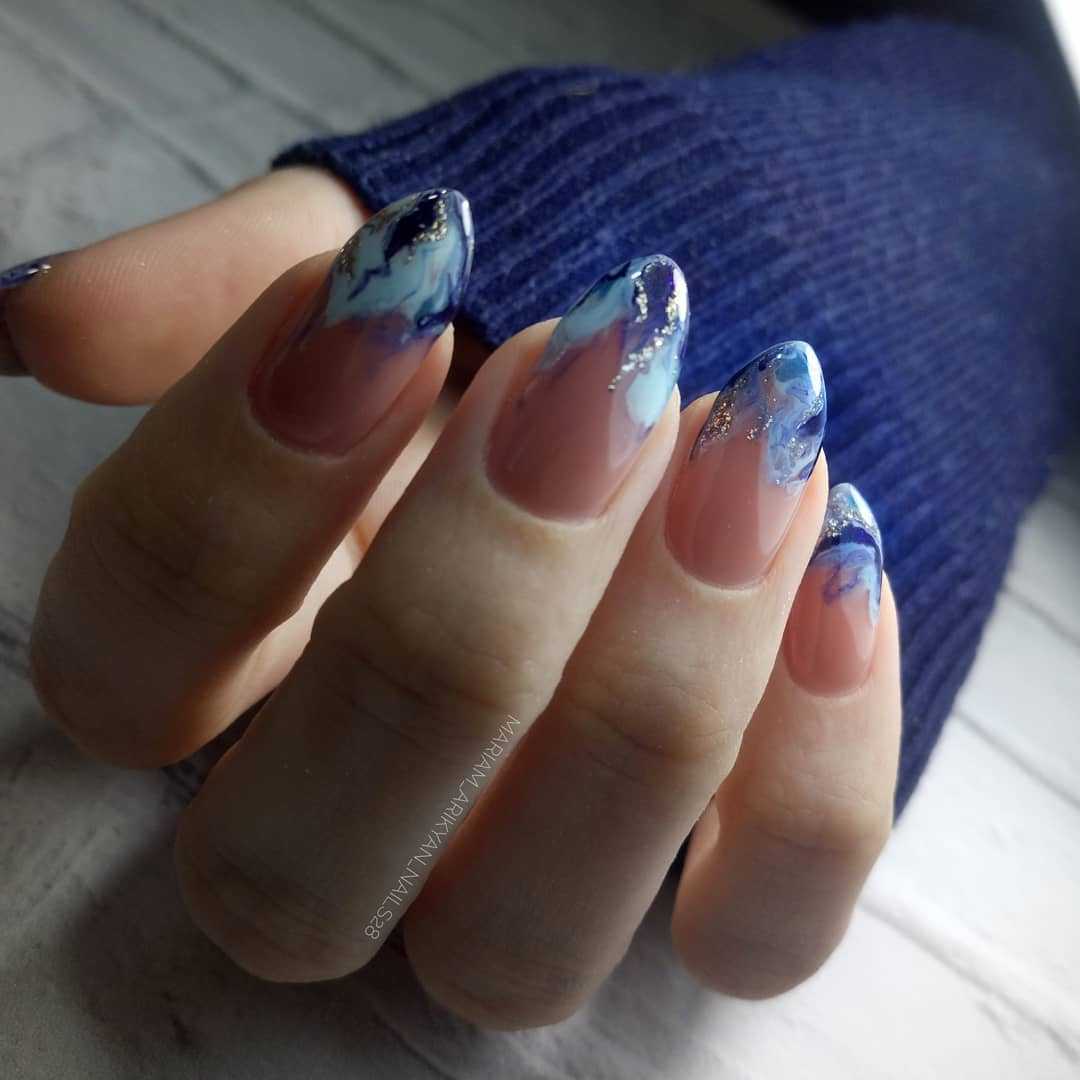 Нежный вариант, который подойдет как для лета, так и для зимы. Если голубой выступает в качестве базы, второй оттенок должен быть насыщеннее и четче. И все наоборот, если голубой цвет используется для создания фактуры камня.
