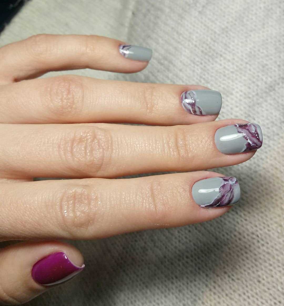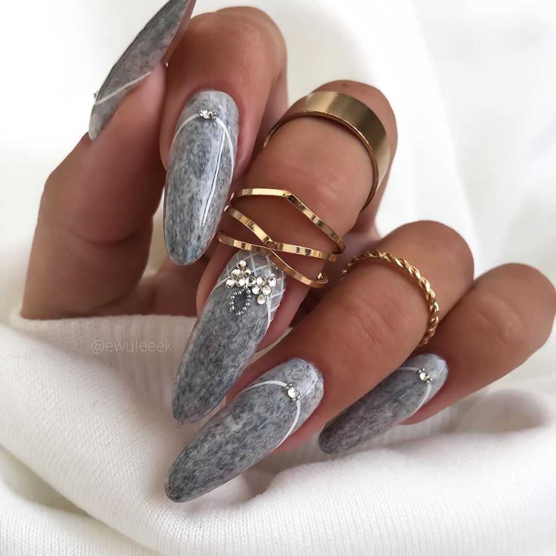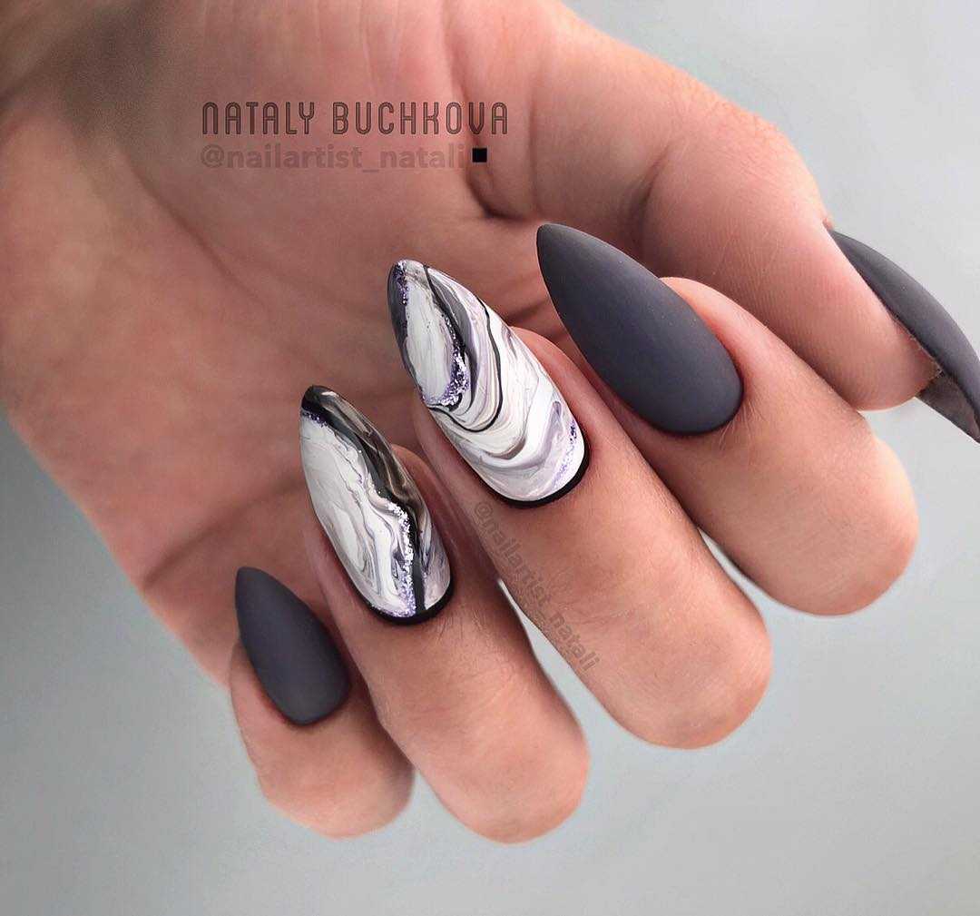 Благодаря тому, что серый входит в список базовых цветов мраморного нейл-дизайна, различные вариации этого маникюра в серых тонах просто не могут смотреться неудачно
