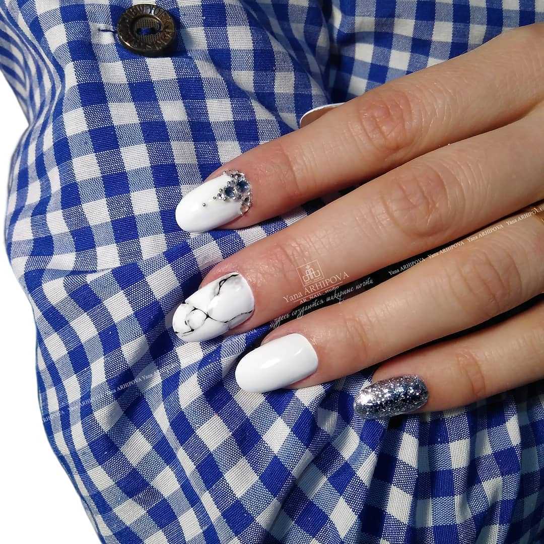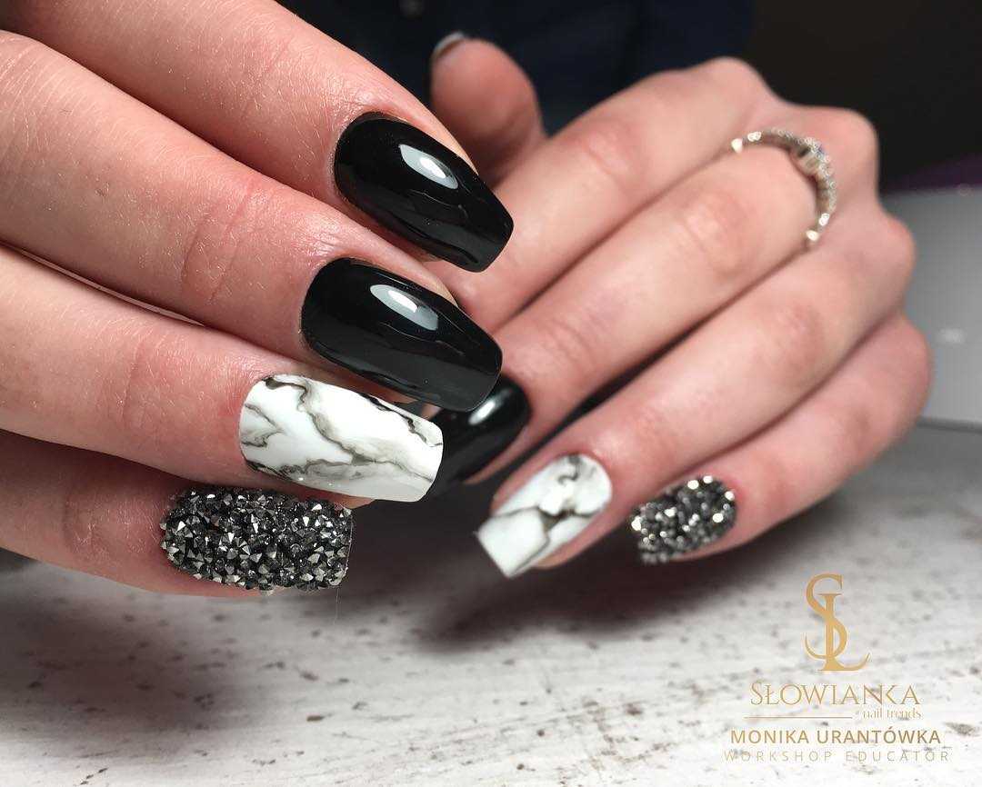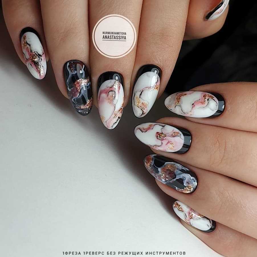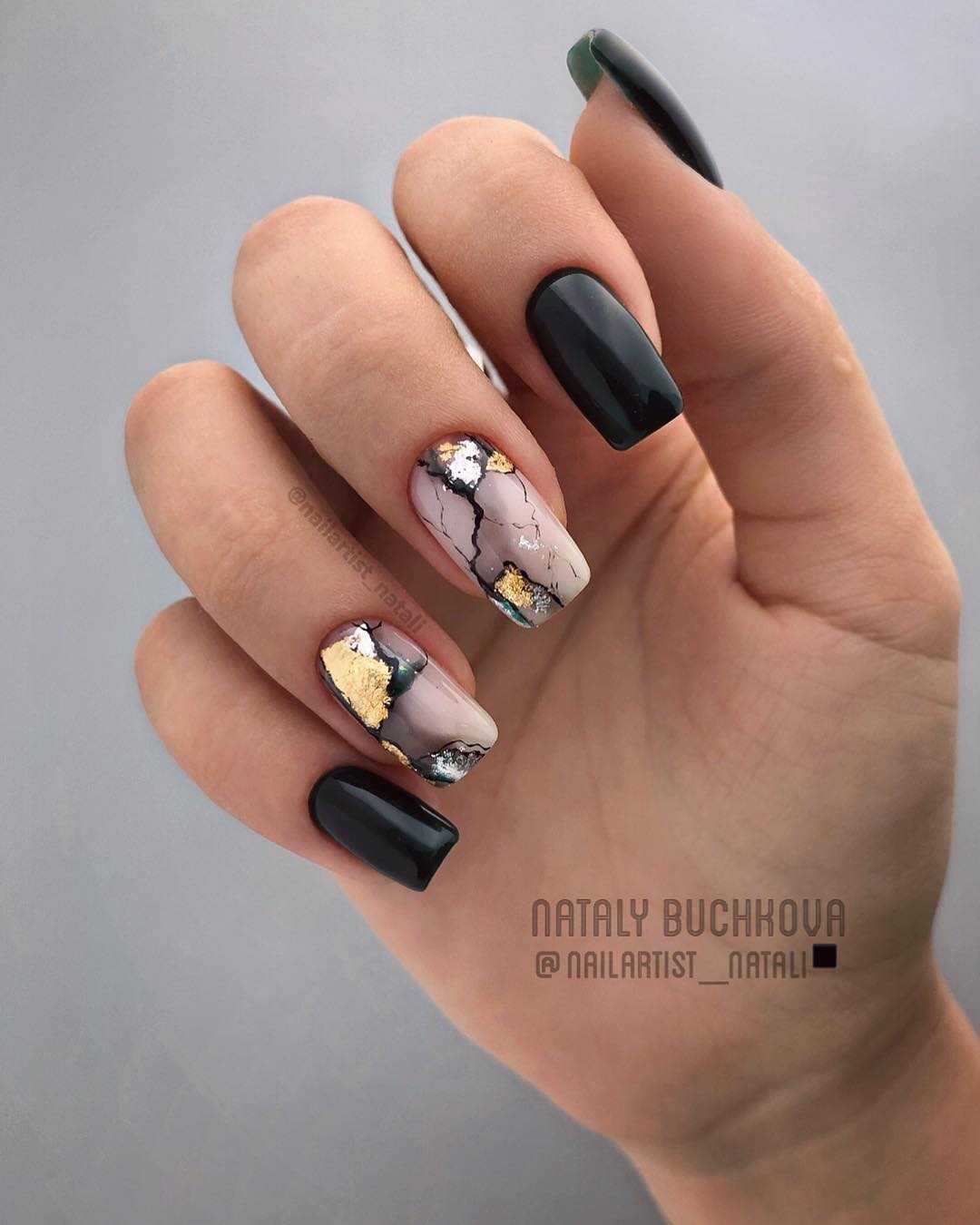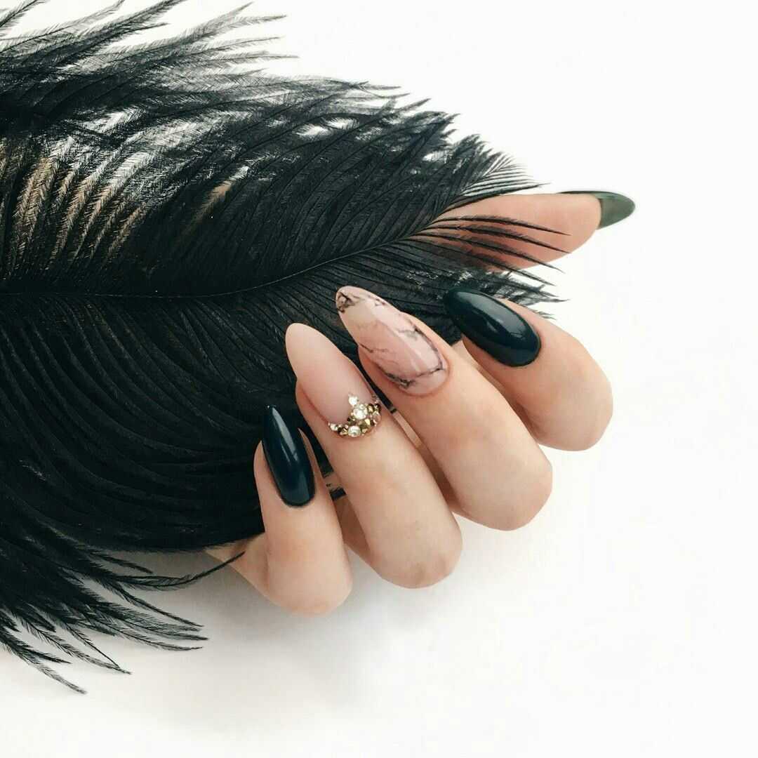 Глубина и элегантность чёрного просто удивительно сочетается на ногтях с различными мраморными узорами, в результате чего такой маникюр не просто смотрится стильно и притягательно, но и завораживает своей многогранностью. Узоры в этом случае наносятся более светлым серым или белым лаком, а само оформление может быть как матовым, так и глянцевым. В списке трендов лаконичное мраморное оформление на всех пальчиках и удивительные комбинации текстуры камня с другими оттенками покрытий, геометрические композиции с характерными узорами и сочетание мрамора с блёстками либо блестящими полосками