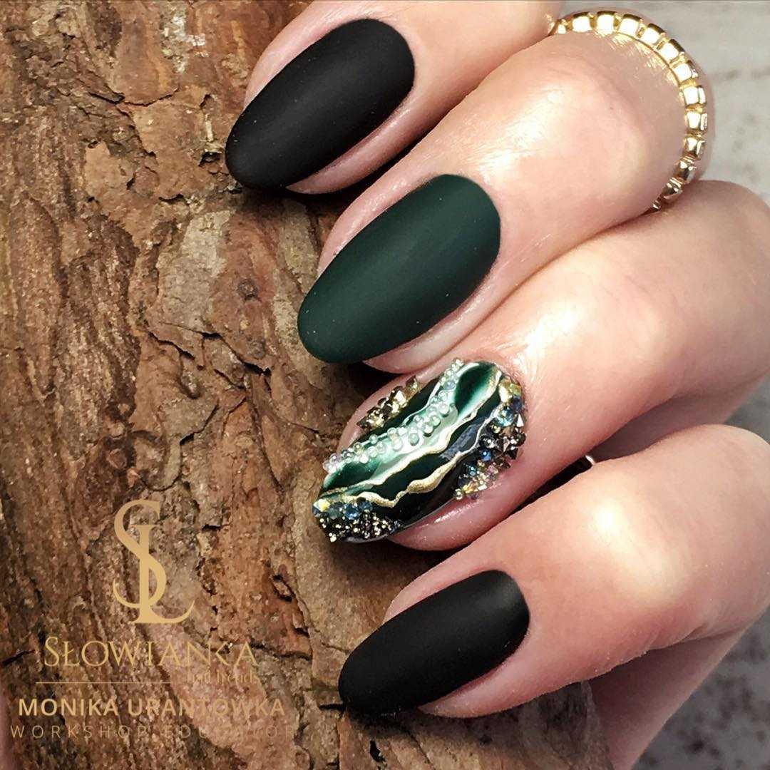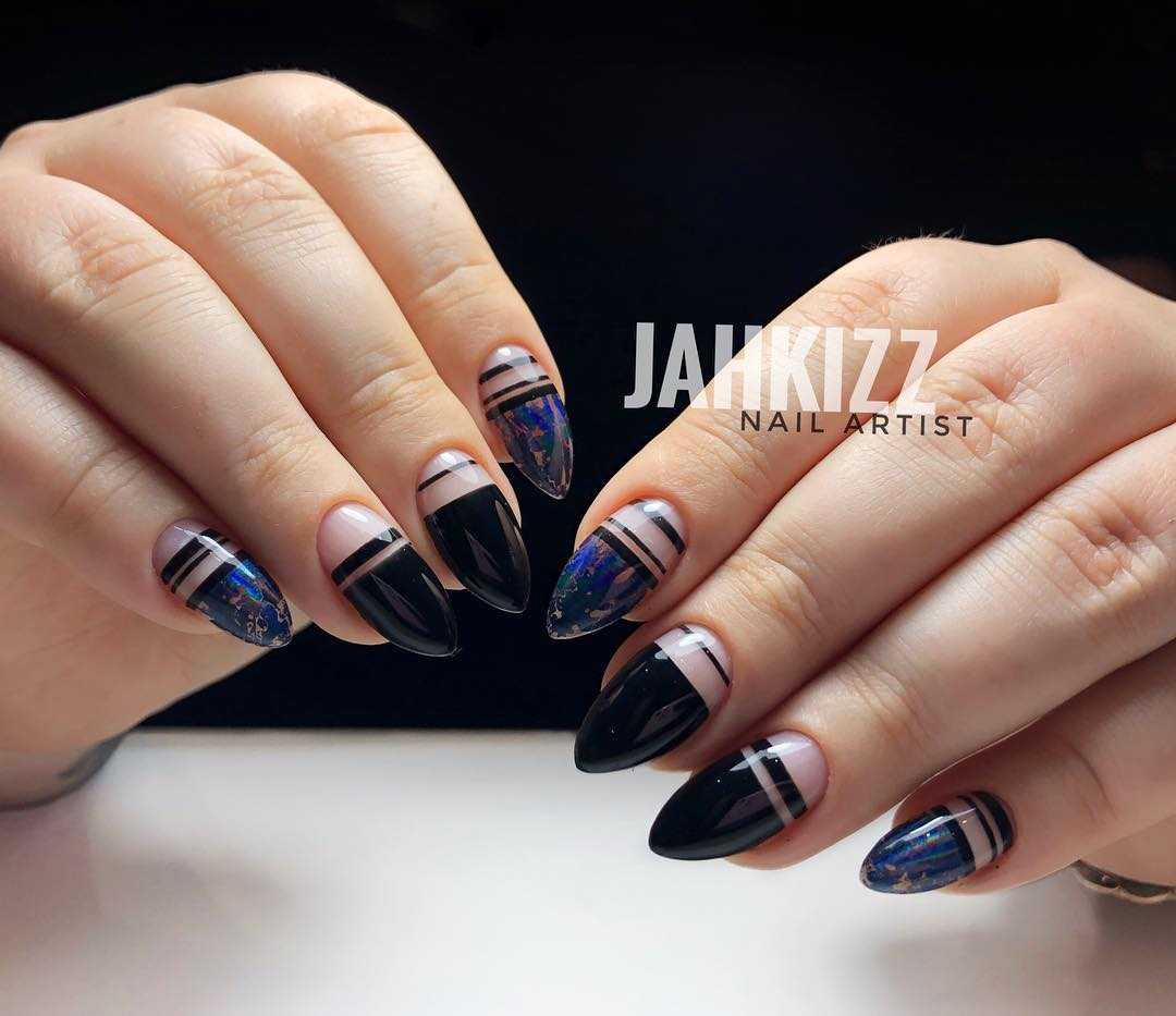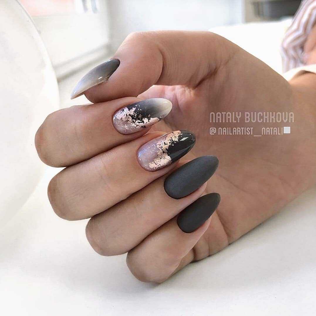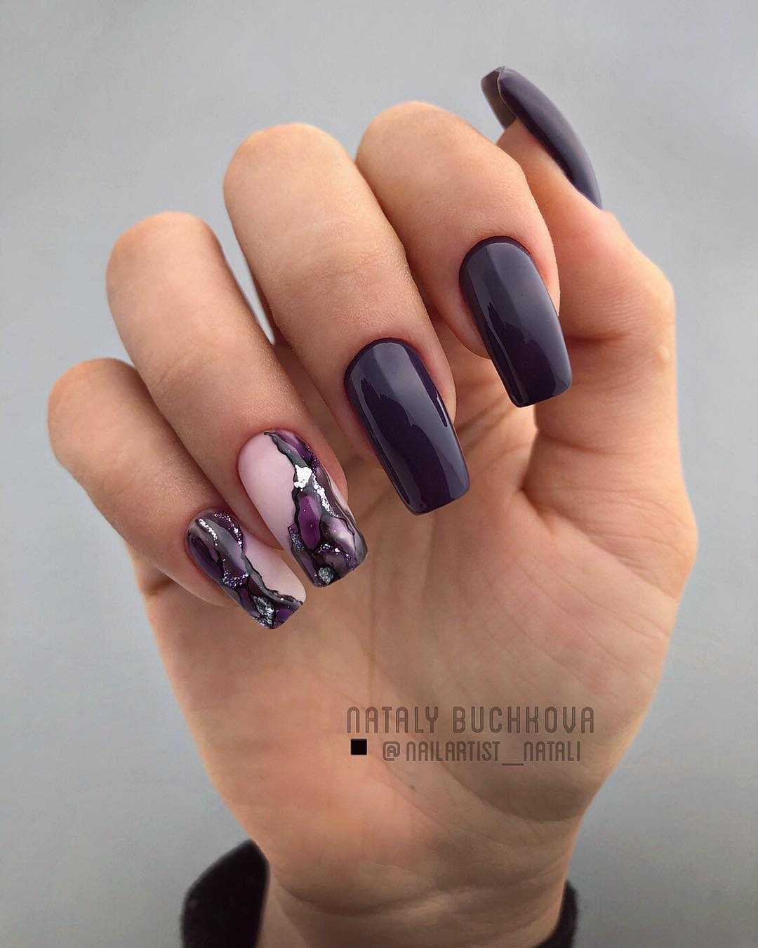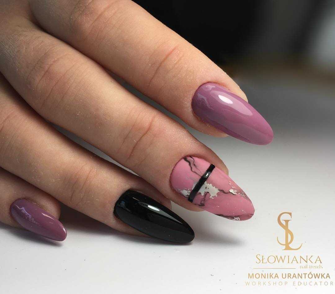 Глубина и элегантность чёрного просто удивительно сочетается на ногтях с различными мраморными узорами, в результате чего такой маникюр не просто смотрится стильно и притягательно, но и завораживает своей многогранностью. Узоры в этом случае наносятся более светлым серым или белым лаком, а само оформление может быть как матовым, так и глянцевым. В списке трендов лаконичное мраморное оформление на всех пальчиках и удивительные комбинации текстуры камня с другими оттенками покрытий, геометрические композиции с характерными узорами и сочетание мрамора с блёстками либо блестящими полосками