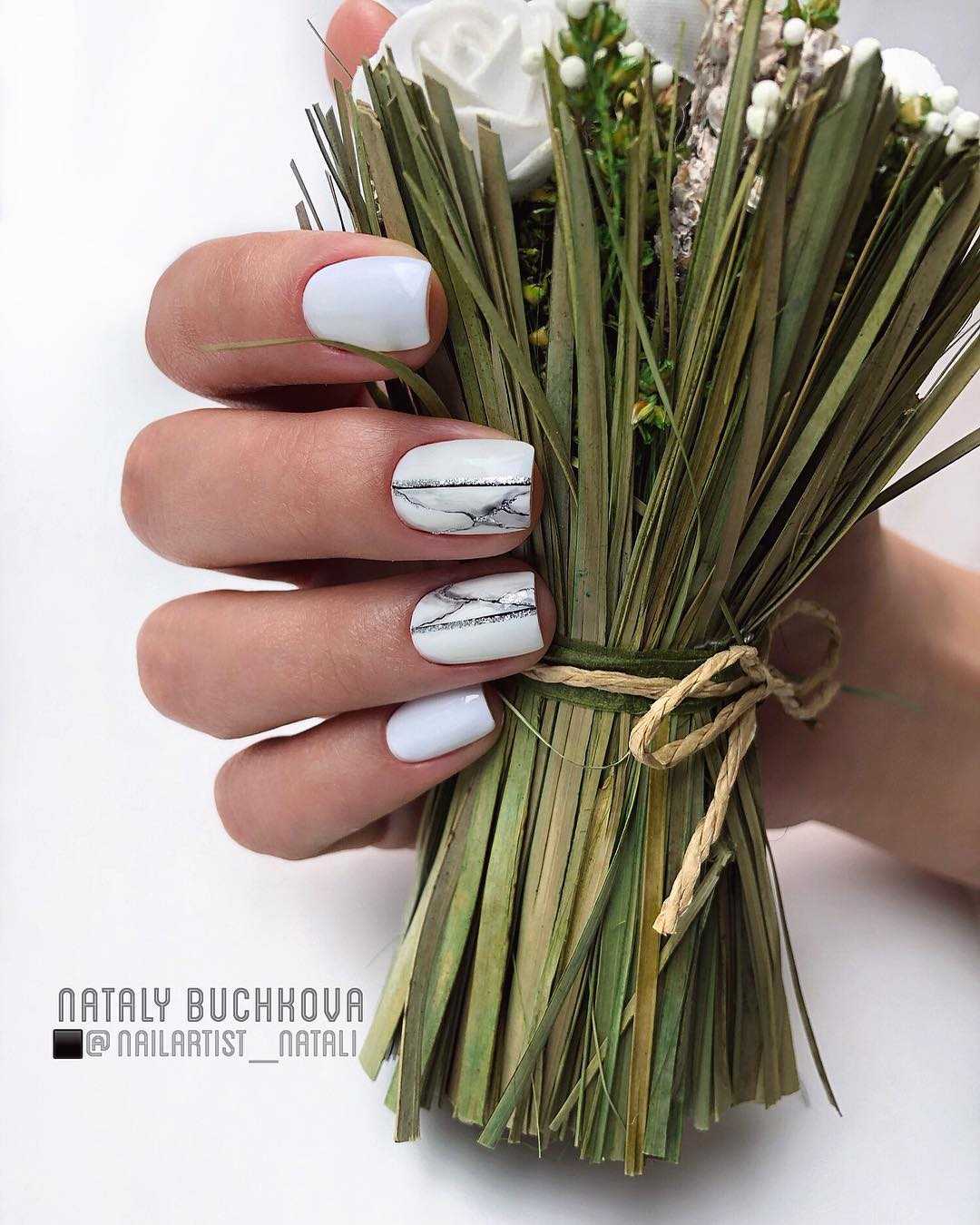Дизайн маникюра «marble stone», выполненный в классическом белом цвете считается наиболее популярным и востребованным, ведь ни один другой цвет лака не способен в полной мере передать изящество разводов и линий, которые являются визитной карточкой мраморного оформления. Белоснежная основа с хаотичными тонкими полосками тёмного или нейтрального цвета выглядит очень красиво и завораживающе. При этом, если вы не используете стемпинг, дублирование узоров от ноготка к ноготку просто невозможно. Белый мраморный маникюр будет уместно смотреться с любым стилем одежды, тем более, что всегда можно разнообразить дизайн втиркой, глиттером и различными украшениями. Особенно интересным решением можно назвать тандем классического френча с белым мрамором, когда характерными узорами выделяют пару ноготков, а тонкие блестящие полоски дублируют разводы и линию улыбки.