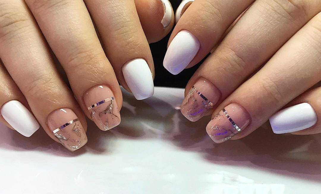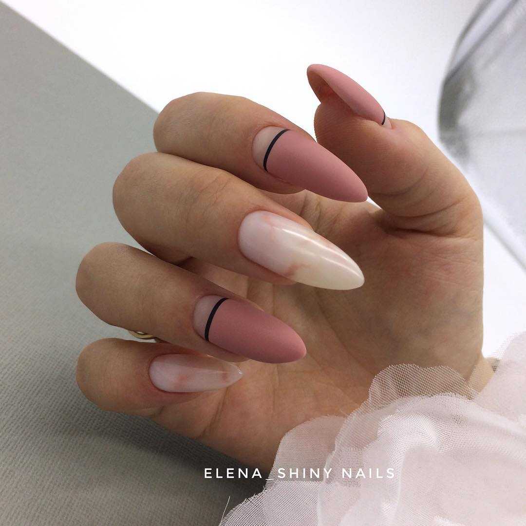 Это вариант дизайна, сочетают два вида декора. Мастера советуют выбрать базовый оттенок гель лака, а уже к нему подбирать контрастный. Лучше, если сочетание мраморного маникюра и полосок будет на одном или двух пальчиках руки. Иначе дизайн может получиться перегруженным.