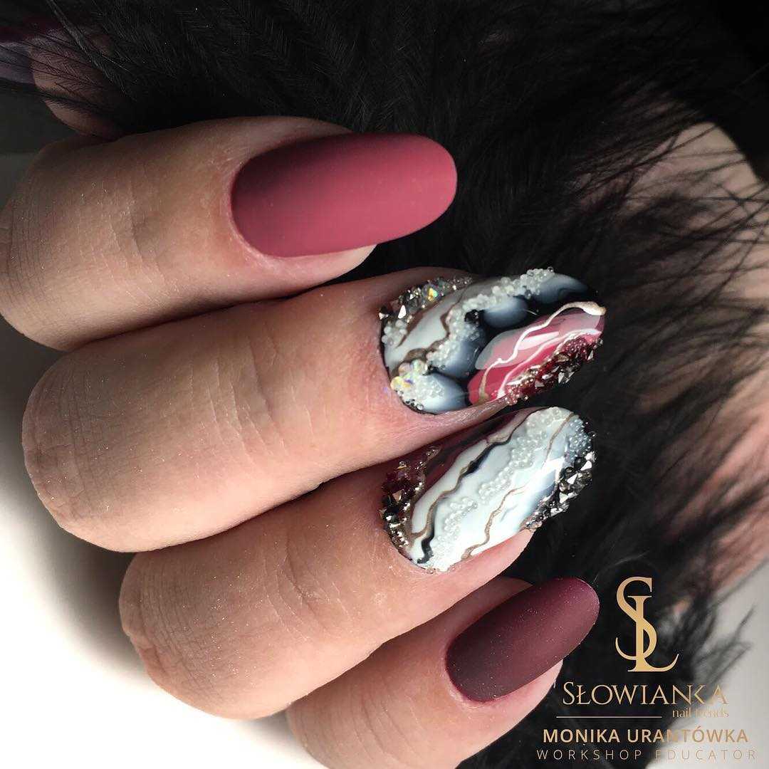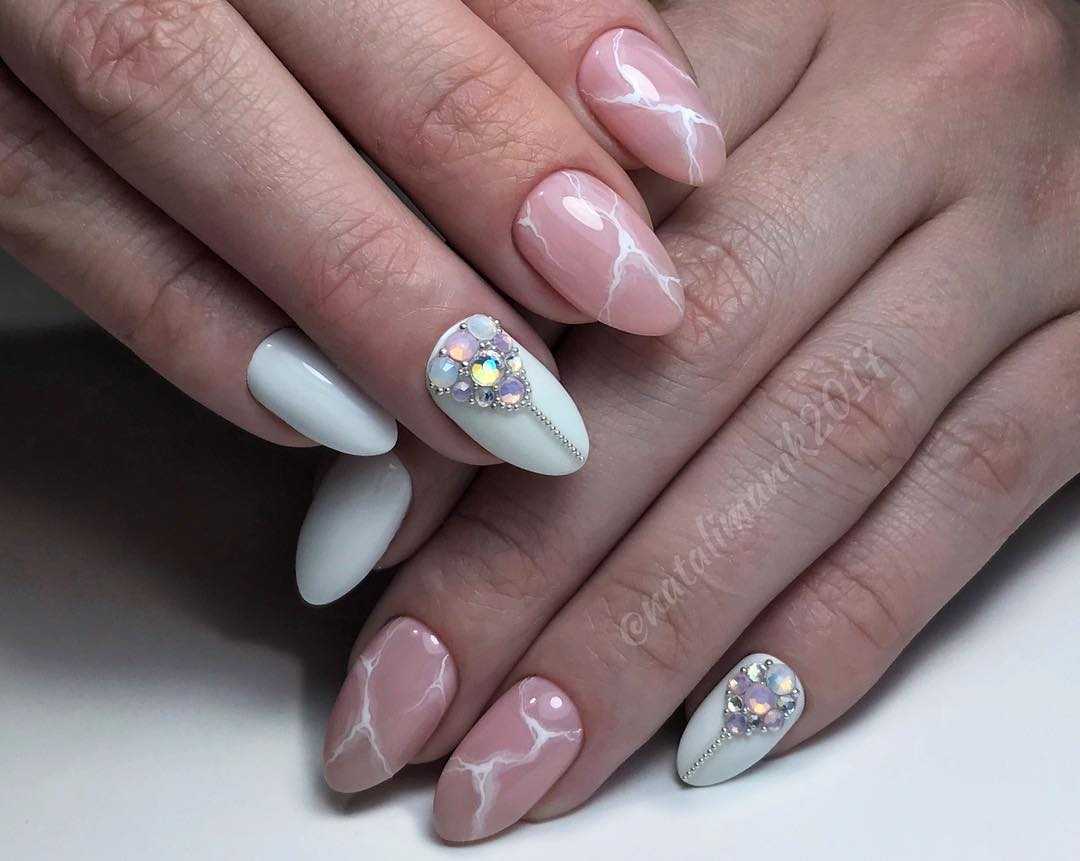 Не стоит думать, что мраморный маникюр нельзя совмещать с другим вариантом дизайна. Основное правило — все в меру.