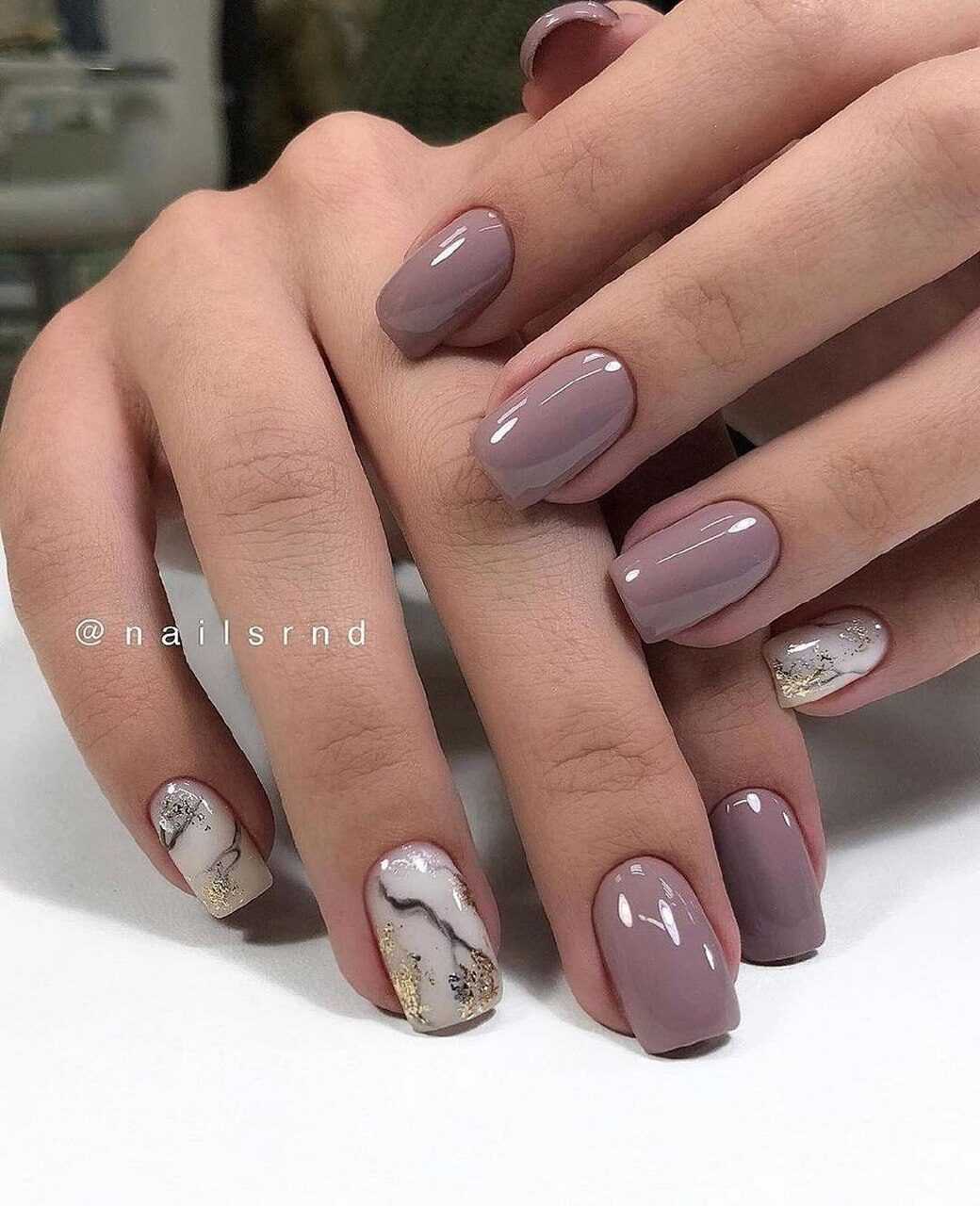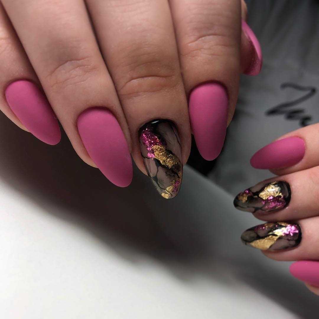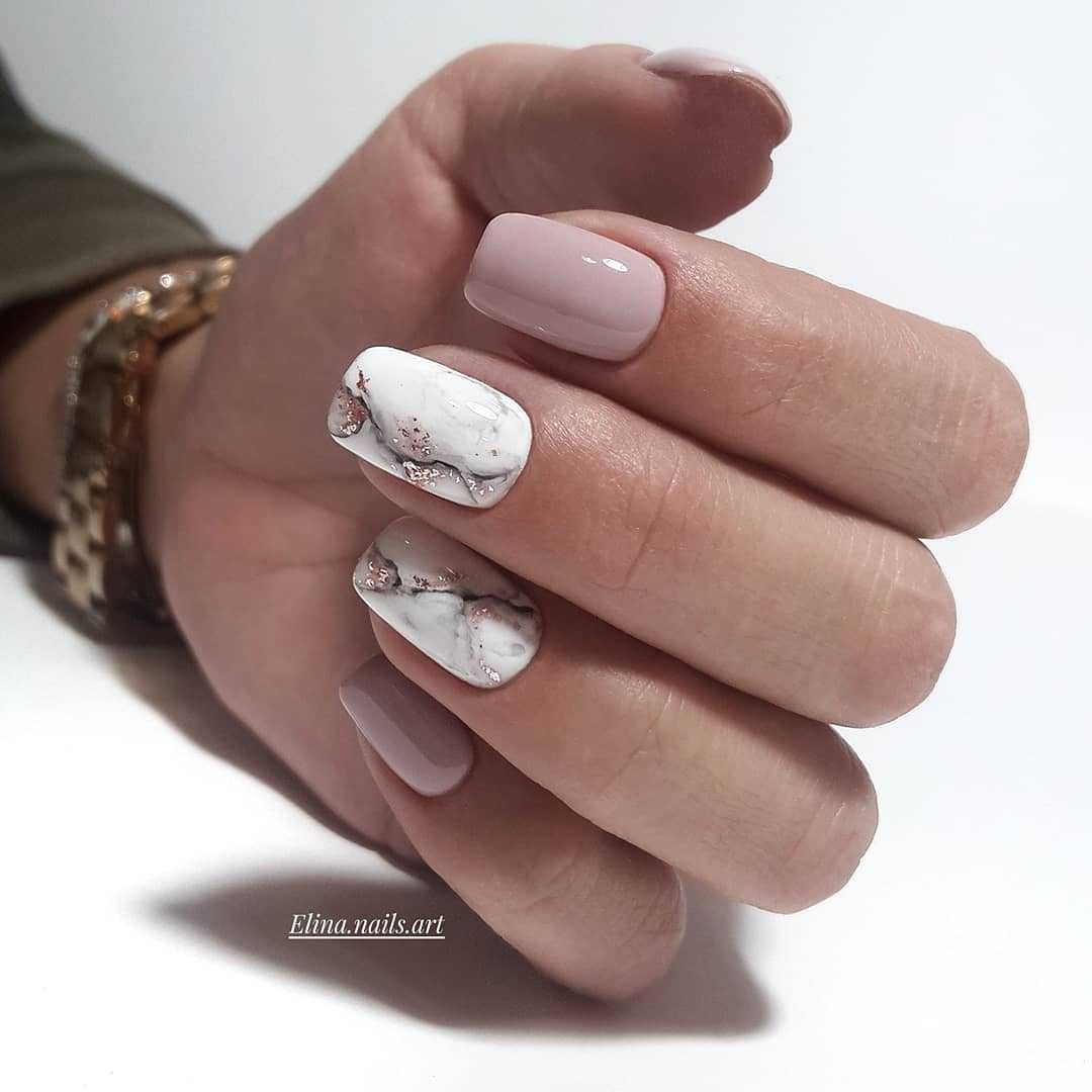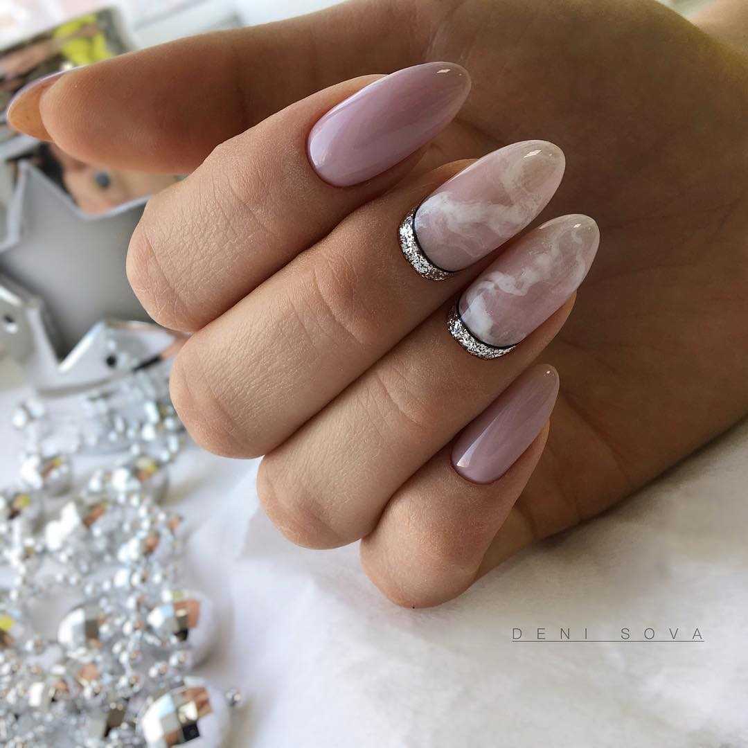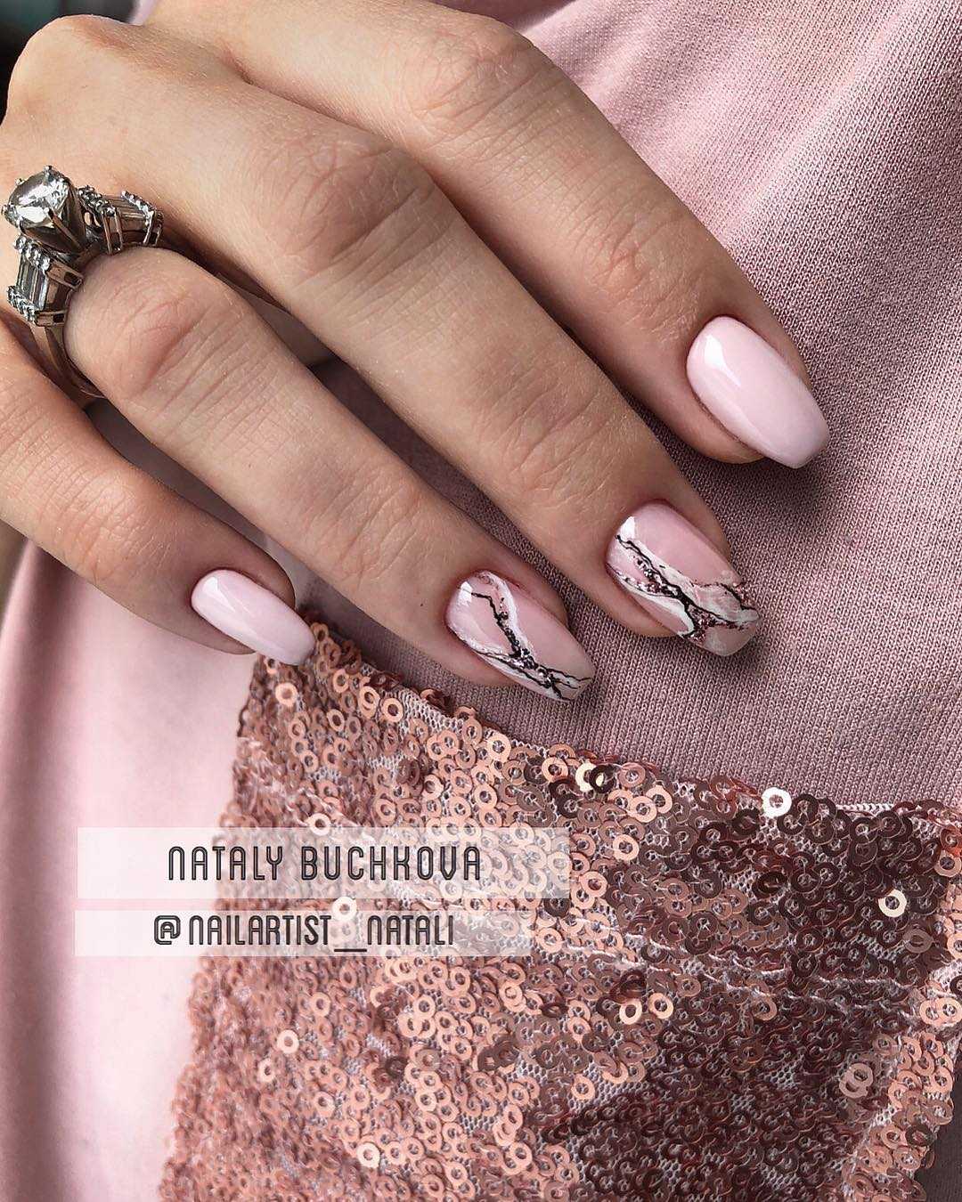 Тем, кто обожает розовые оттенки, не стоит отказываться от мраморного эффекта в маникюре. Такой дизайн смотрится нежно и очень необычно. Основой может стать белый или розово-прозрачный гель лак. Дополнить дизайн можно серебристыми прожилками или фольгой.