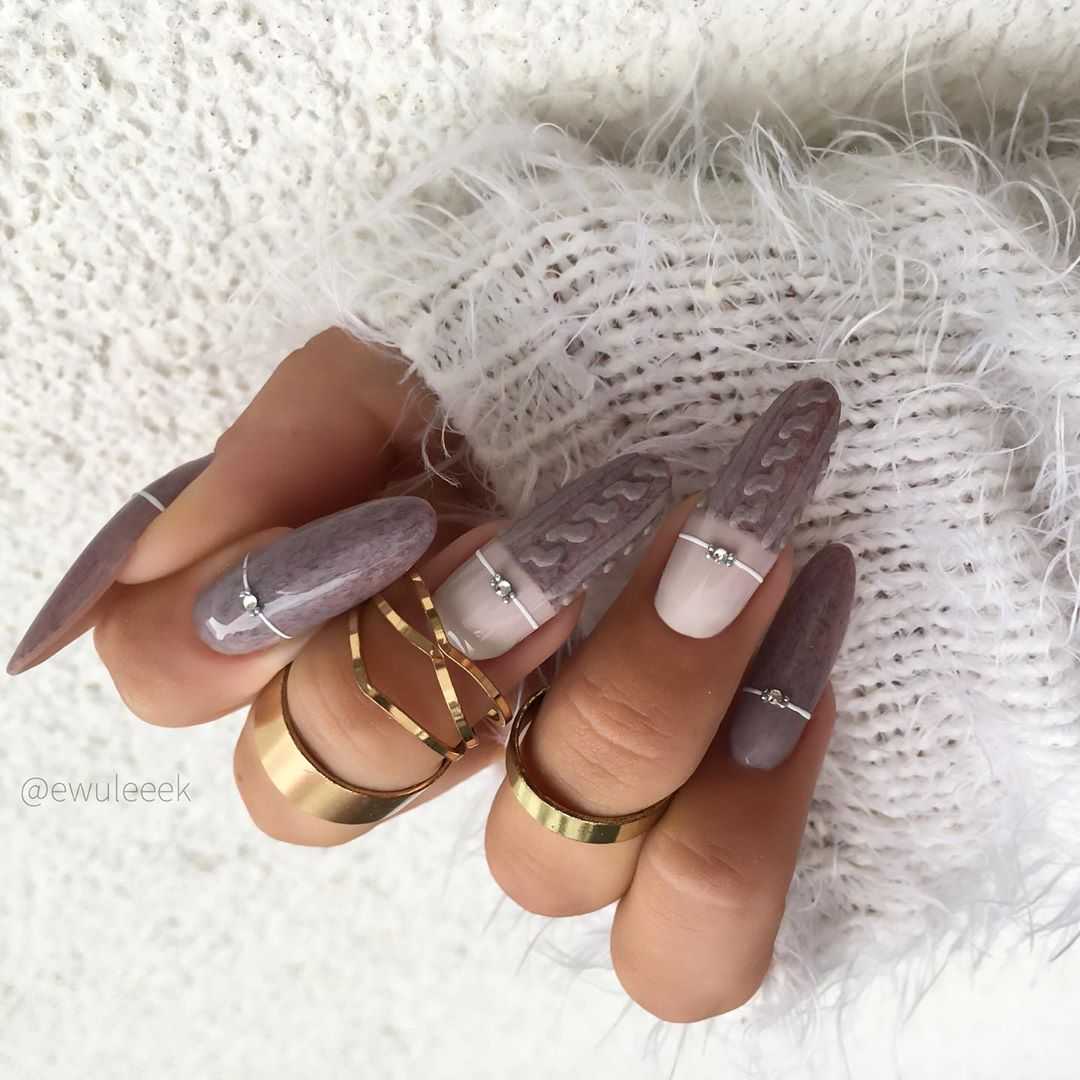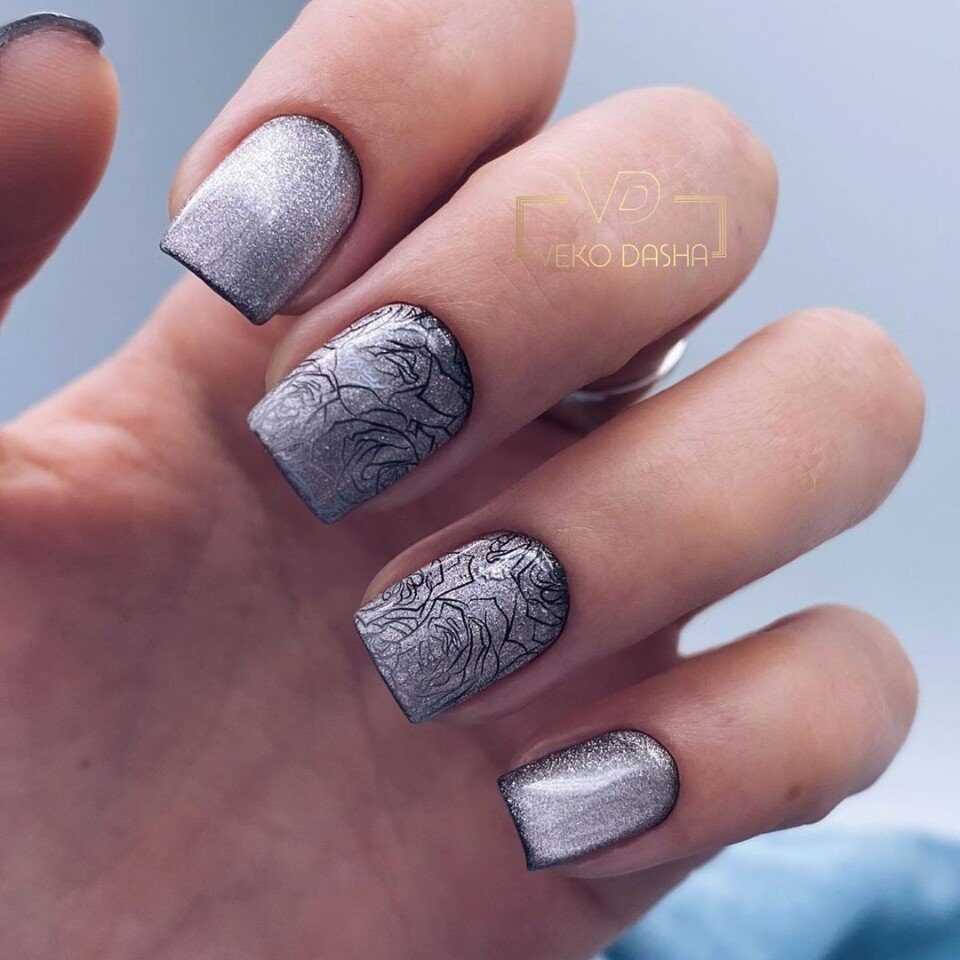 При этом весьма интересно выглядят и привлекают внимание не только дуэтные сочетания серого с белым или чёрным, но и оригинальные трио, в состав которых входят как базовые, так и любые другие оттенки, например, розовый. Это могут быть лаконичные и сдержанные идеи оформления, в которых узоры наносятся непосредственно на серое основание, а могут быть различные комбинированные идеи с цветными мраморными разводами, стразами, фольгой и прочими дополнениями