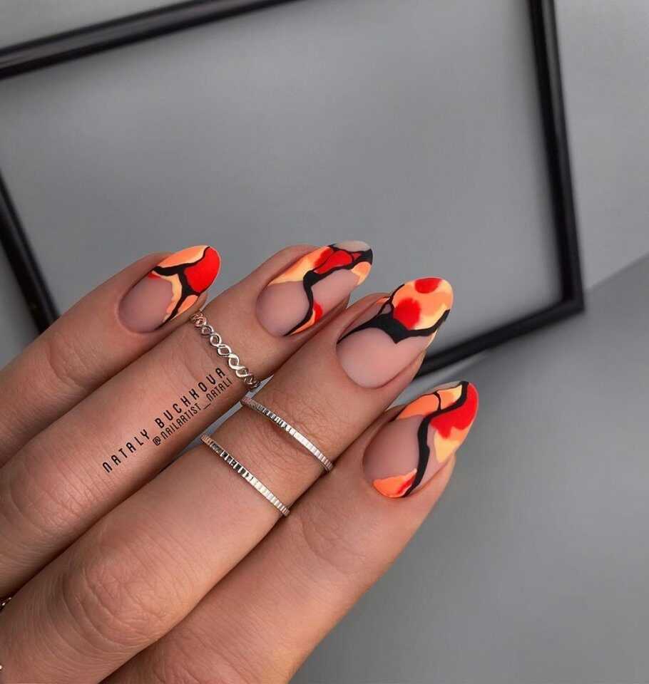 На большой длине эффектно смотрится и контрастный, и нюдовый, и цветной мраморный маникюр. Особенно завораживающе выглядит дизайн с одним оформленным в стиле «marble stone» ноготком и матовой текстурой на остальных.