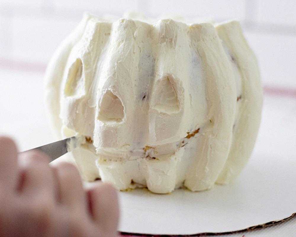 Торт достаем с кольца и при помощи ножа придаем ему форму круглой тыквы.