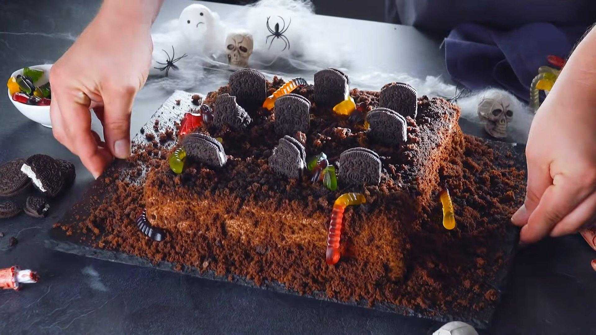Вы можете взять за основу любой любимый рецепт. Согласитесь, хэллоуинское настроение торту придает декор