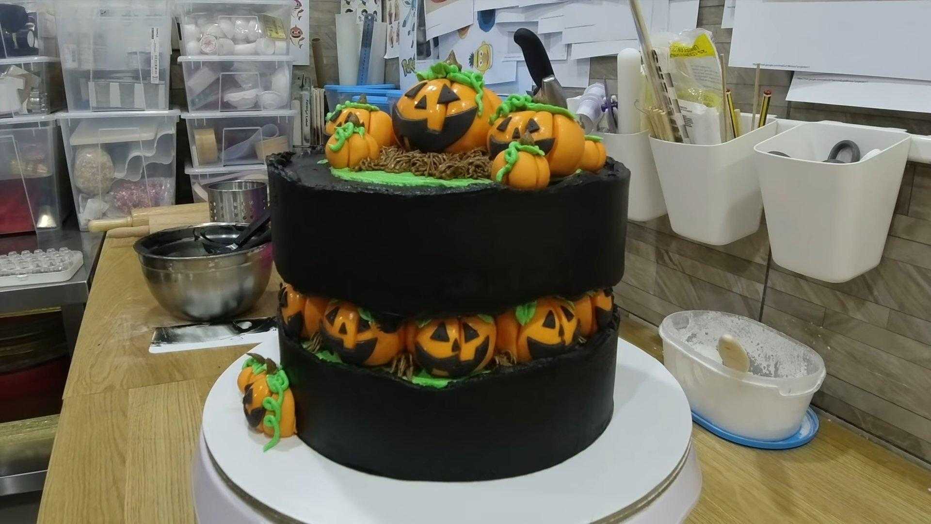 - Обтянуть основу оранжевой мастикой. Кондитерской палочкой сформировать контуры тыквы. Жёлтым фондантом покрыть верх, оттенить рот, нос, глаза. Сверху посадить котика.