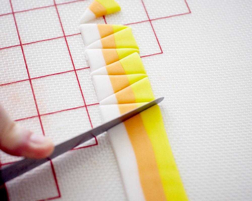 - Оранжевую, жёлтую, белую полоски склеить между собой водой. Их раскатать скалкой в ленточку-триколор. Из неё нарезать маленькие треугольники, которые разместить вокруг лакомства.