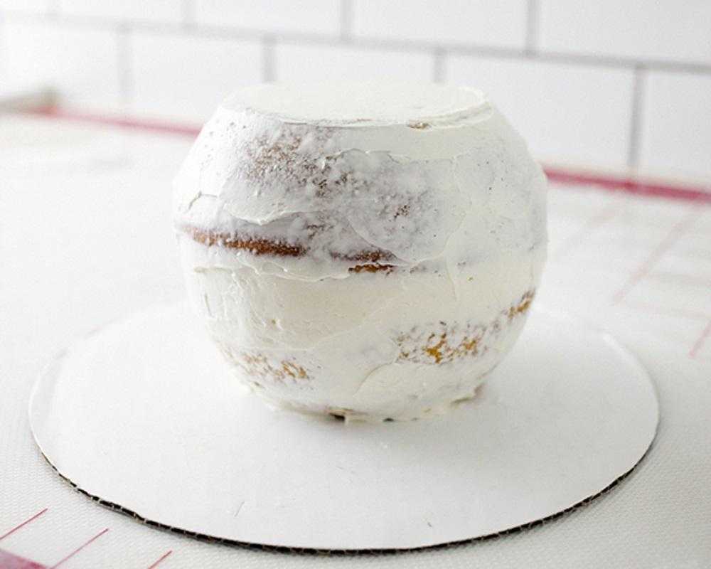 - Готовым кремом смазать одну часть десерта. Поверх него положить вторую половину. Также покрыть весь шар кремовой основой.